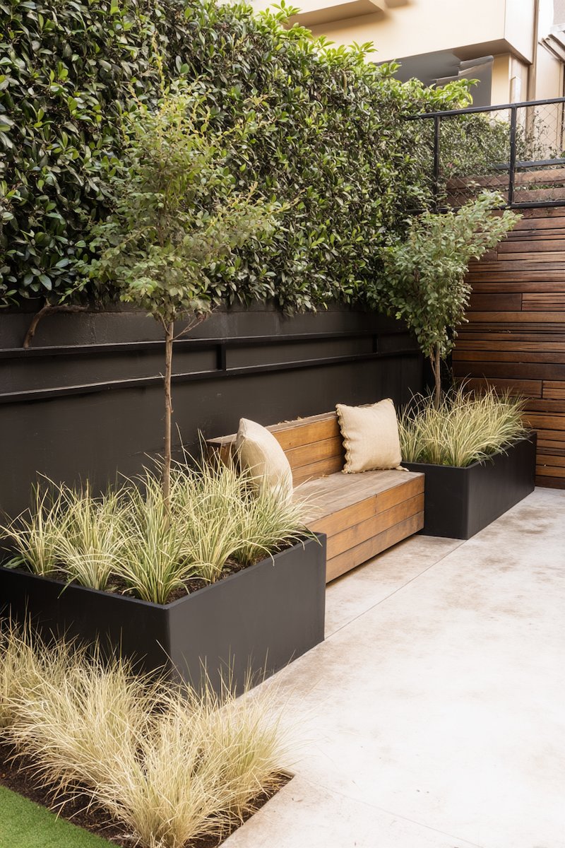 This design features sleek black planters filled with soft, flowing grasses, creating a striking contrast against the smooth concrete and warm wooden seating. To replicate this look, choose low-maintenance plants like ornamental grasses and incorporate minimalist furniture for a serene outdoor space.