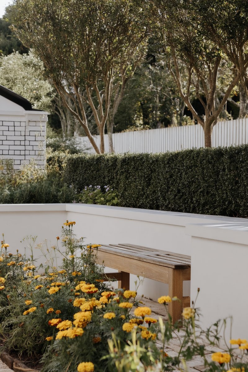 This contemporary garden beautifully showcases vibrant marigold blooms, adding a splash of cheerful yellow against a backdrop of lush greenery and crisp white walls. To replicate this look, consider using low-maintenance plants like marigolds and incorporating simple wooden seating to create a cozy, inviting space.