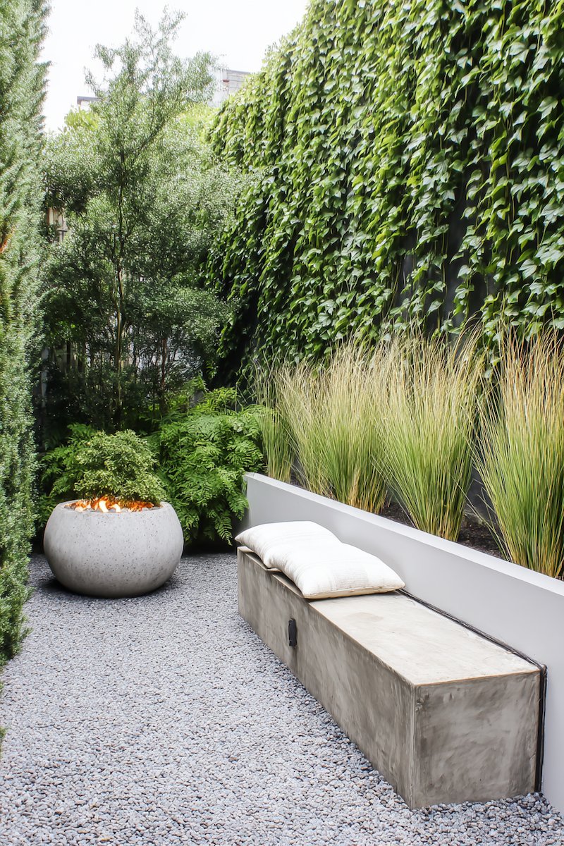 The harmonious blend of soft grasses and lush ferns creates a serene retreat, complemented by a sleek concrete bench and modern fire feature. For a similar look, choose and incorporate gravel for easy maintenance and a contemporary feel.