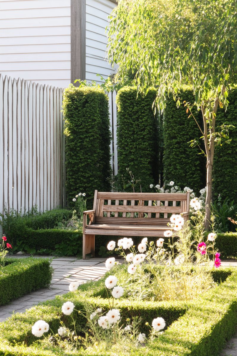 This contemporary garden features elegant white daisies nestled among lush, geometric hedges, creating a serene and inviting atmosphere. To replicate this look, incorporate low-maintenance plants and consider adding a simple wooden bench for a cozy seating area.