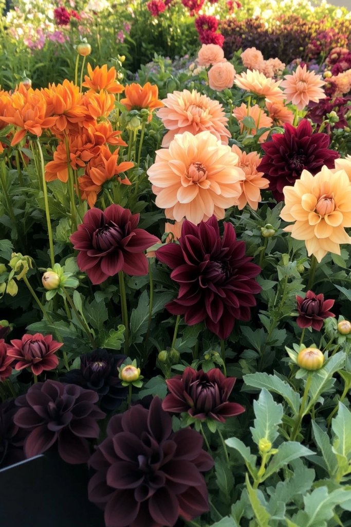 A dazzling mix of burnt-orange dahlias, coral snapdragons, peach lisianthus, deep red rudbeckia, and bronze chrysanthemums captures the warmth of a sunset. The golden hour light enhances the warm gradients, making the petals glow. To achieve this effect, blend warm-hued flowers in varying shades and plant where they’ll receive late-afternoon sun.