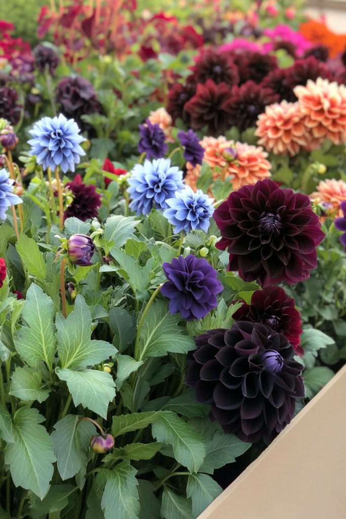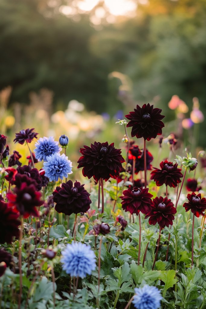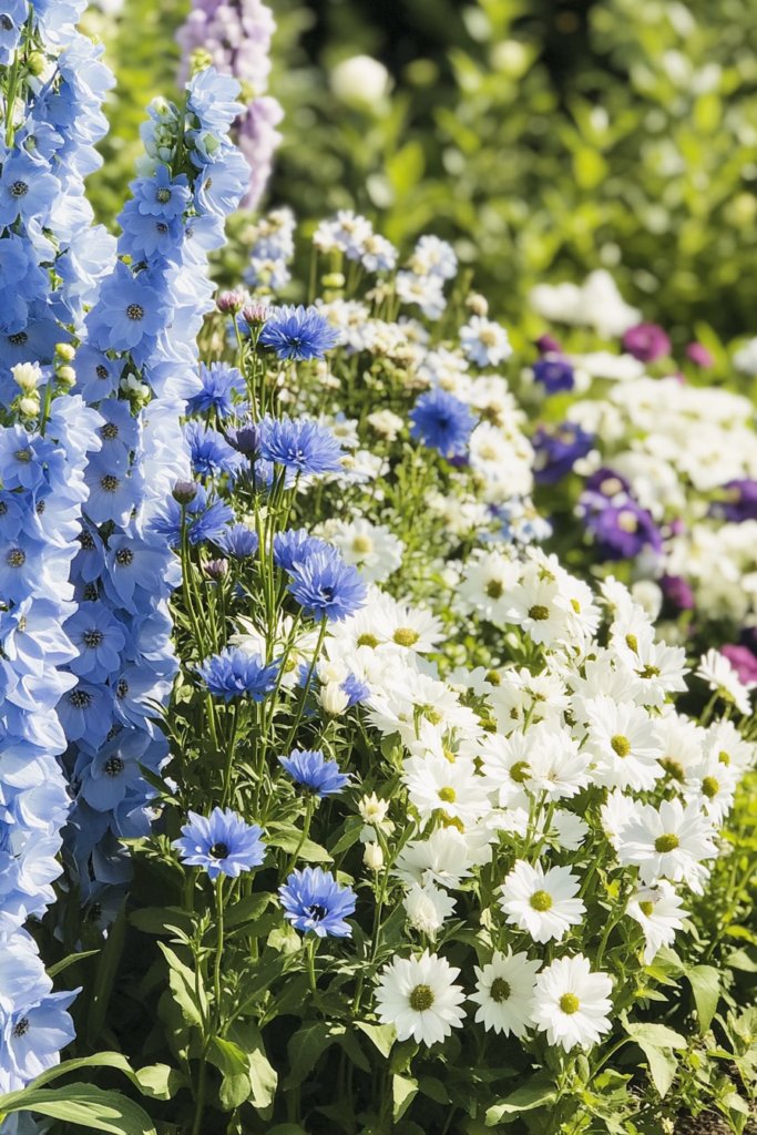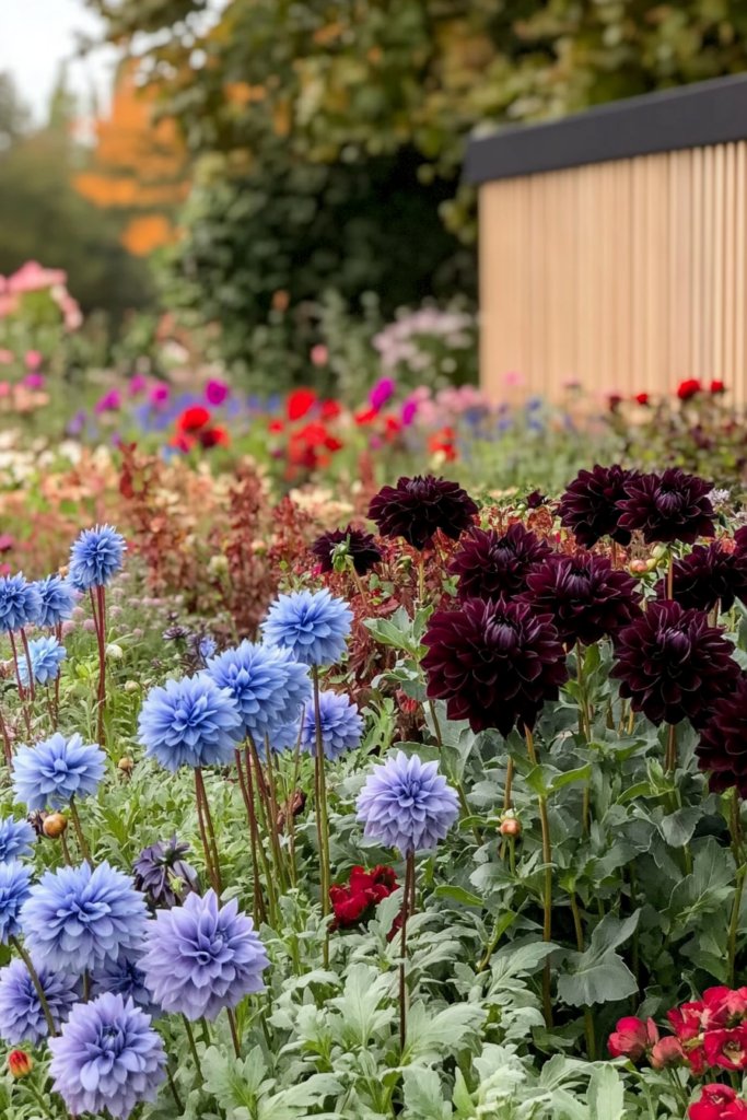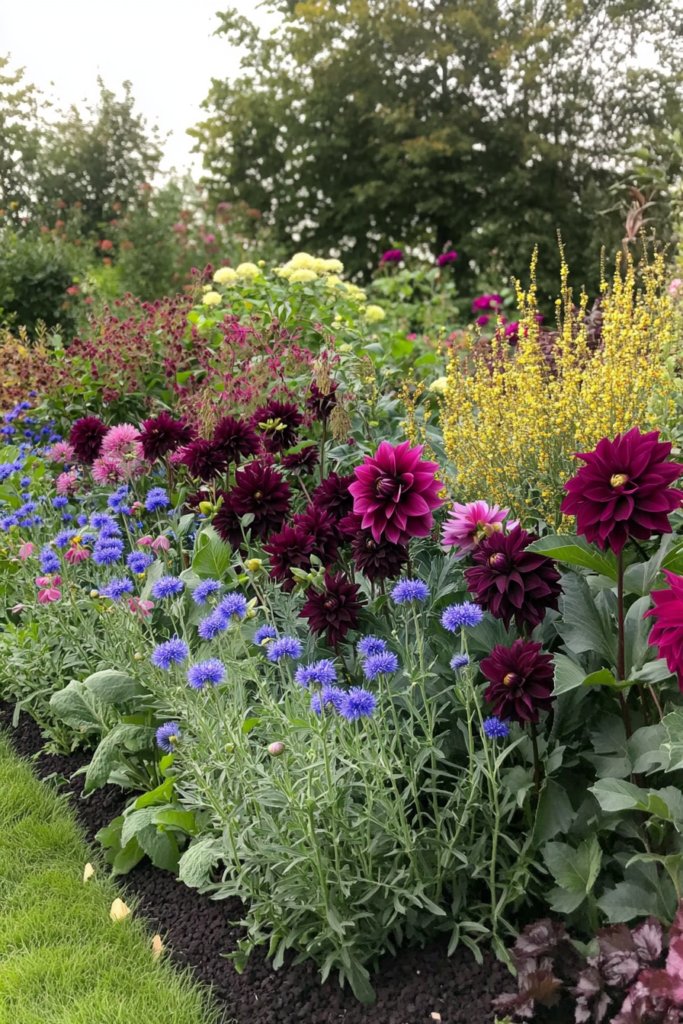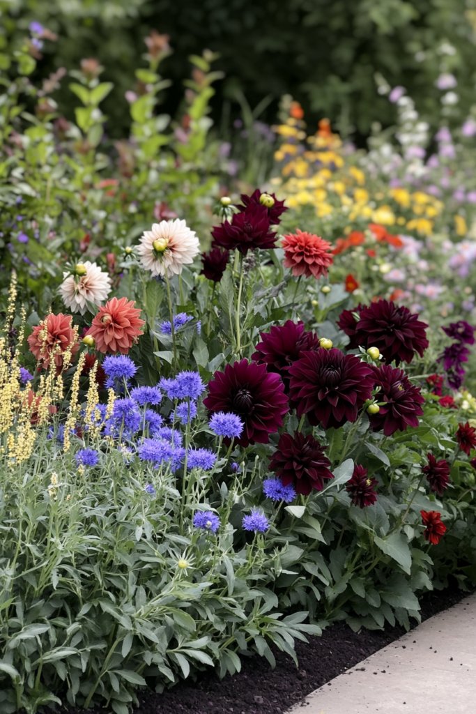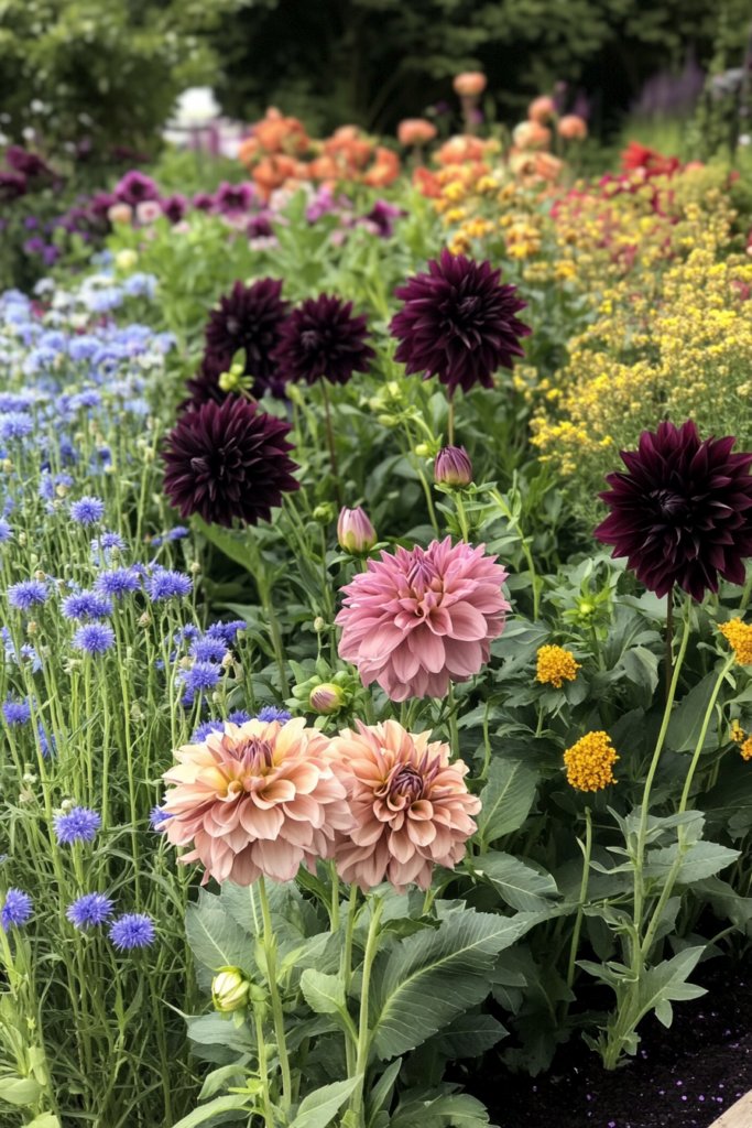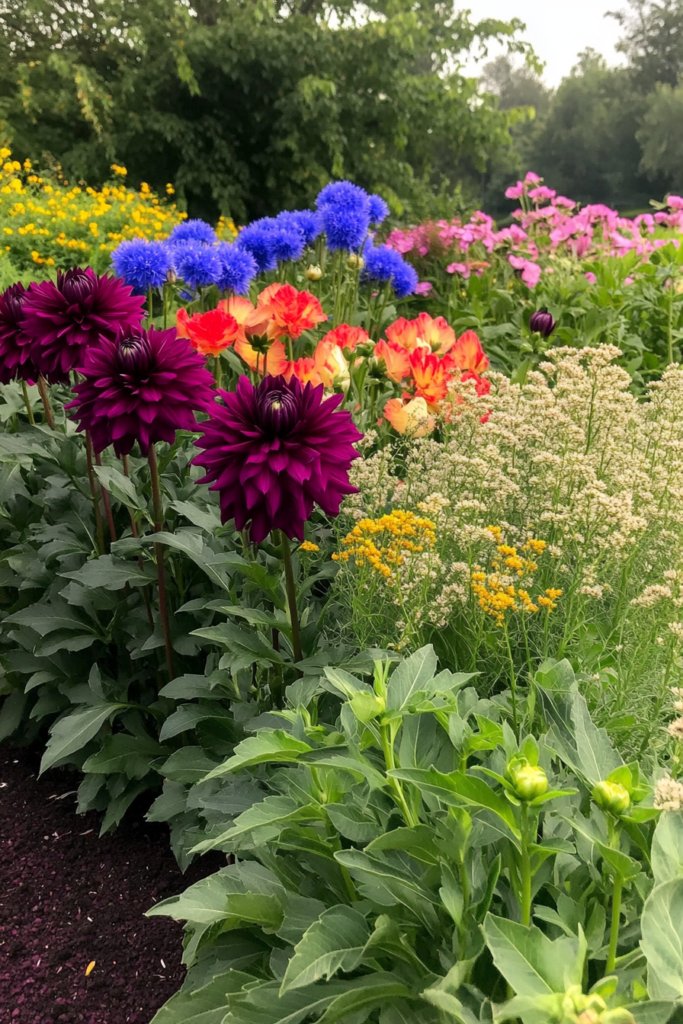 A dramatic combination of magenta dahlias, sapphire-blue cornflowers, burgundy scabiosa, and golden yarrow creates a striking jewel-toned garden. The deep greens of the foliage enhance the richness of the colors, making them pop under natural daylight. For this effect, mix bold, saturated hues and use well-spaced plantings to allow each bloom to shine.