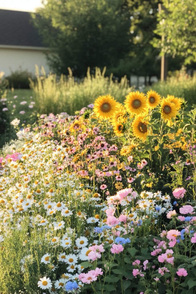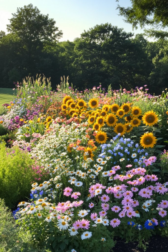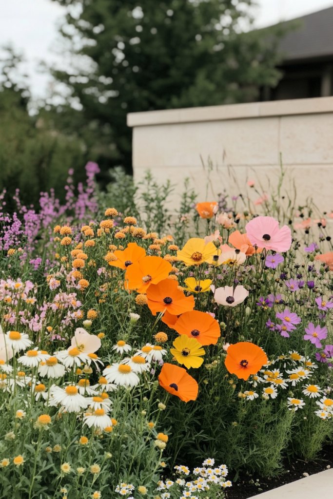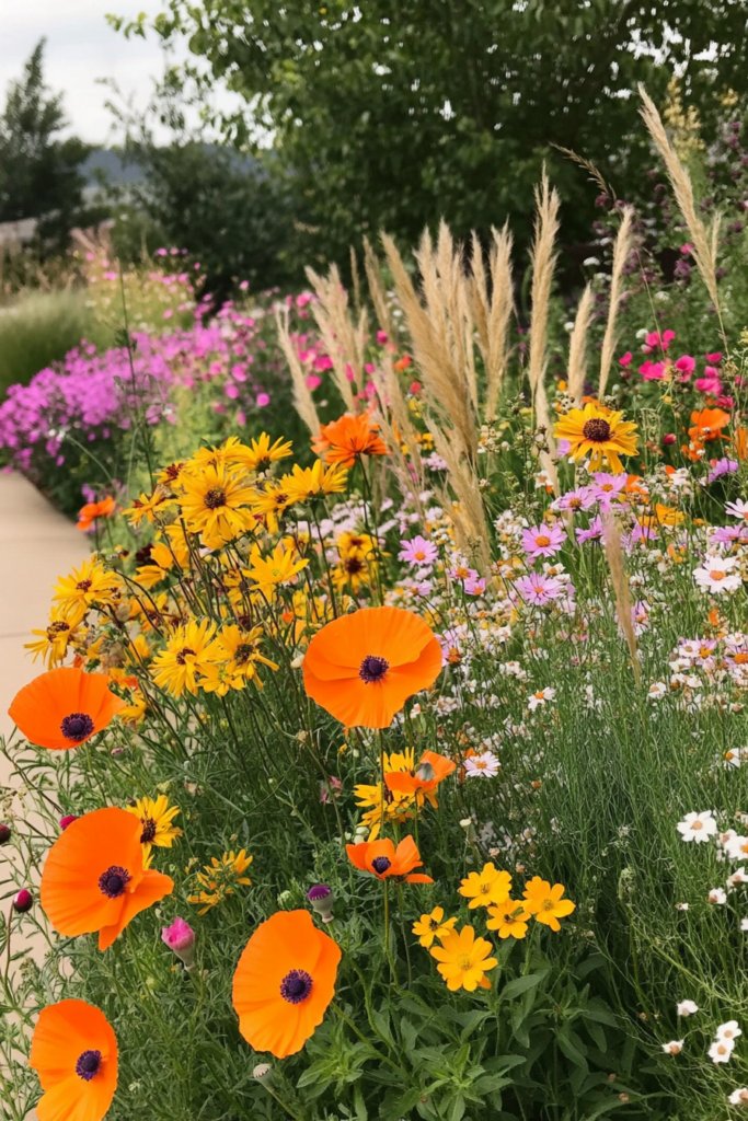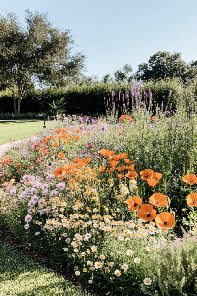 A joyful explosion of golden coreopsis, orange poppies, pink cosmos, and violet larkspur brings a whimsical feel to this wildflower patch. Sunlight dances on the delicate petals as they sway in the breeze. Mimic this look by planting a mix of self-seeding wildflowers in a natural, unstructured layout, allowing them to spread freely for a carefree aesthetic.
