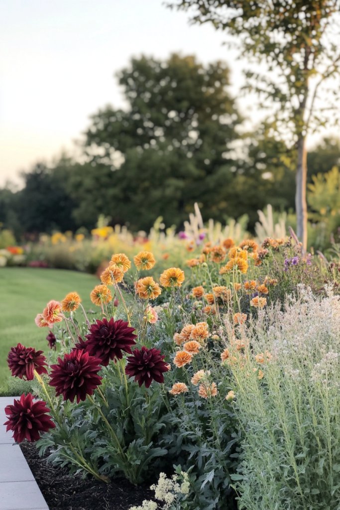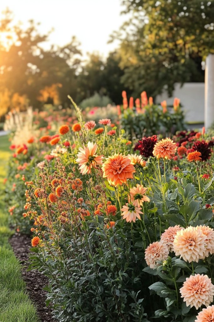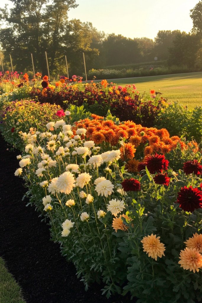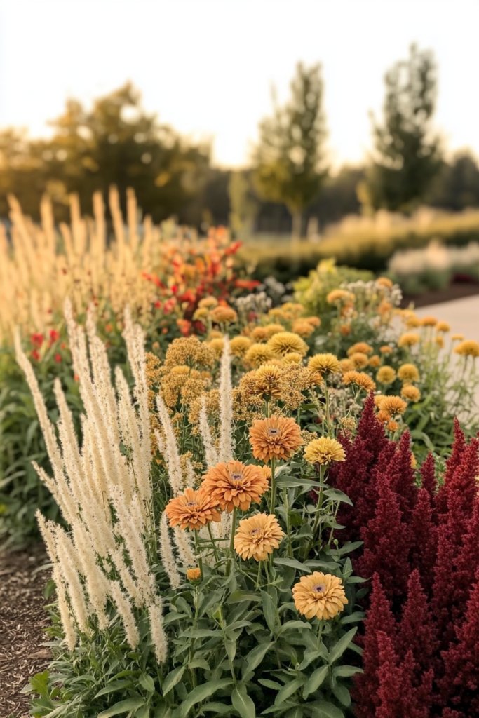 Inspired by the warmth of golden hour, this striking floral bed glows with amber chrysanthemums, burnt-orange celosia, rich red dahlias, and golden rudbeckia. The low sun casts long, dramatic shadows, intensifying the fiery hues. To recreate this look, choose warm-toned blooms and plant in a location that catches the late-afternoon light for maximum effect.