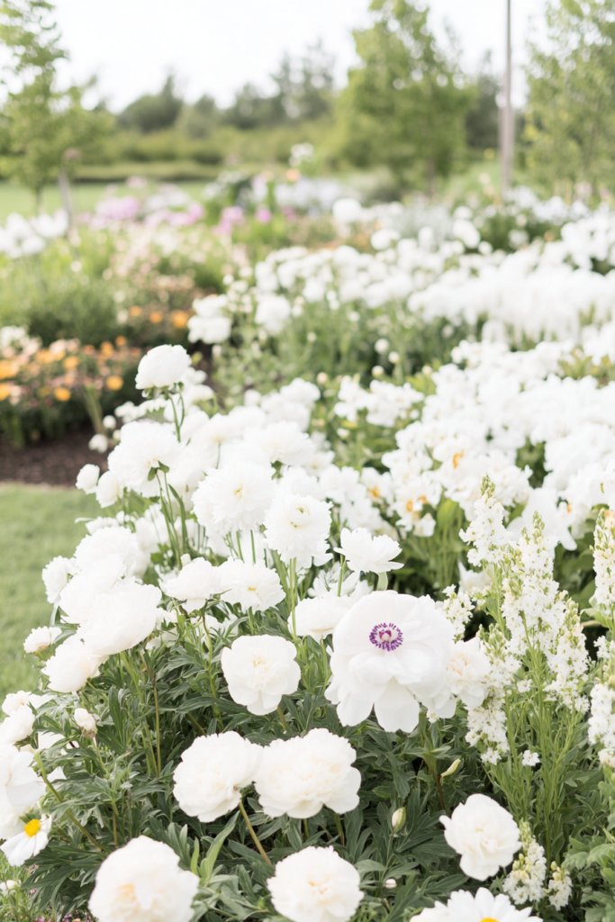 A vision of elegance, this all-white floral bed features lisianthus, cosmos, peonies, and ranunculus. The bright natural light illuminates the crisp petals, creating an ethereal and airy atmosphere. For a similar effect, group white blooms in different heights and textures, using green foliage to add subtle depth.