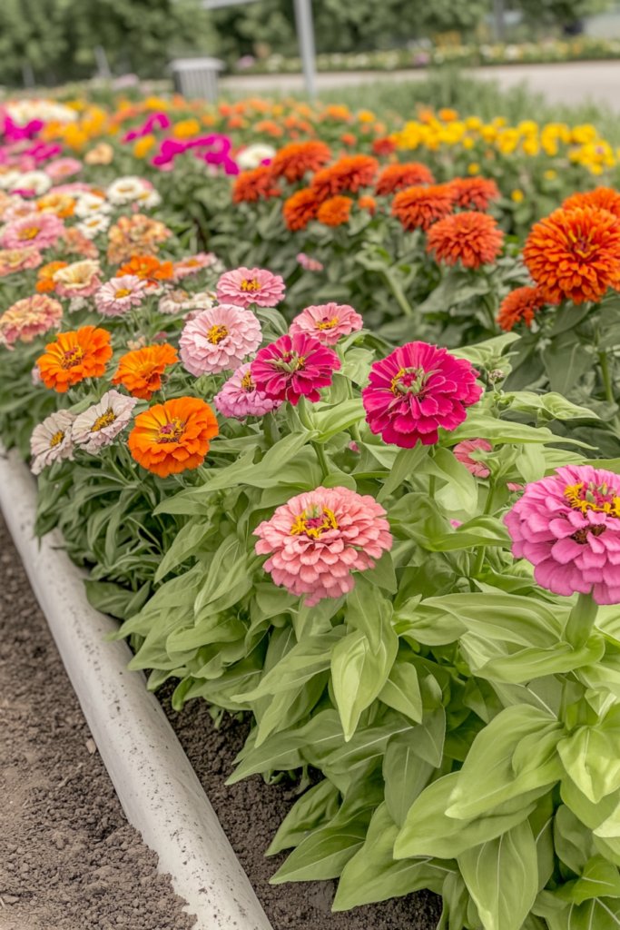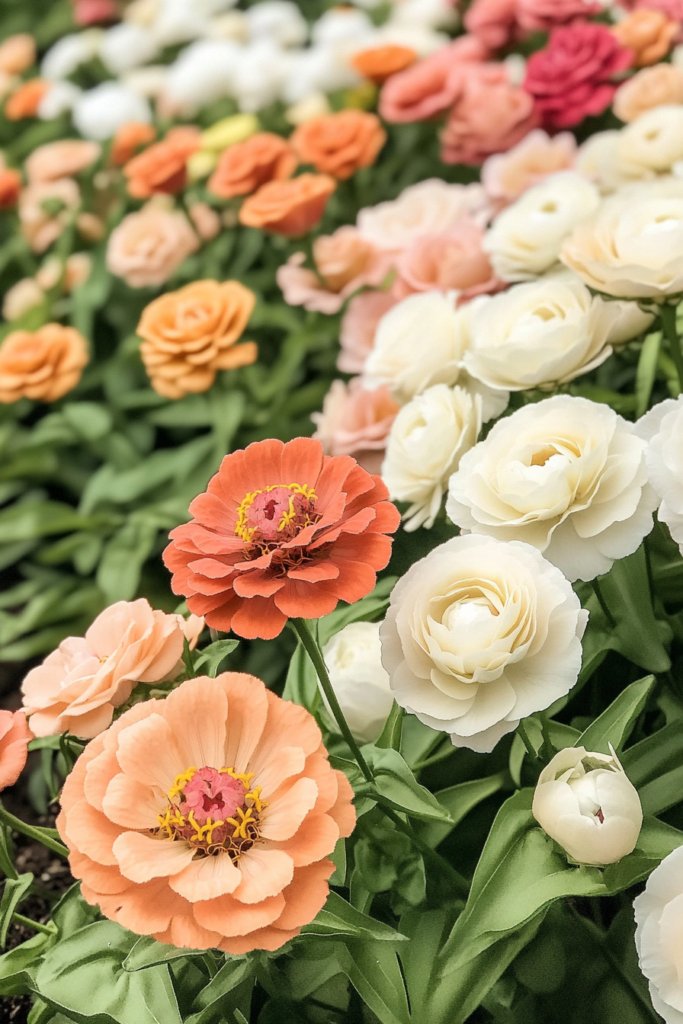 A glowing display of coral zinnias, apricot-hued roses, peach ranunculus, and soft cream snapdragons creates a warm and inviting floral bed. Sunlight bathes the flowers, intensifying their summery tones against lush green foliage. For a similar effect, mix warm peachy hues with soft creams and deep greens to create a balanced, harmonious palette.