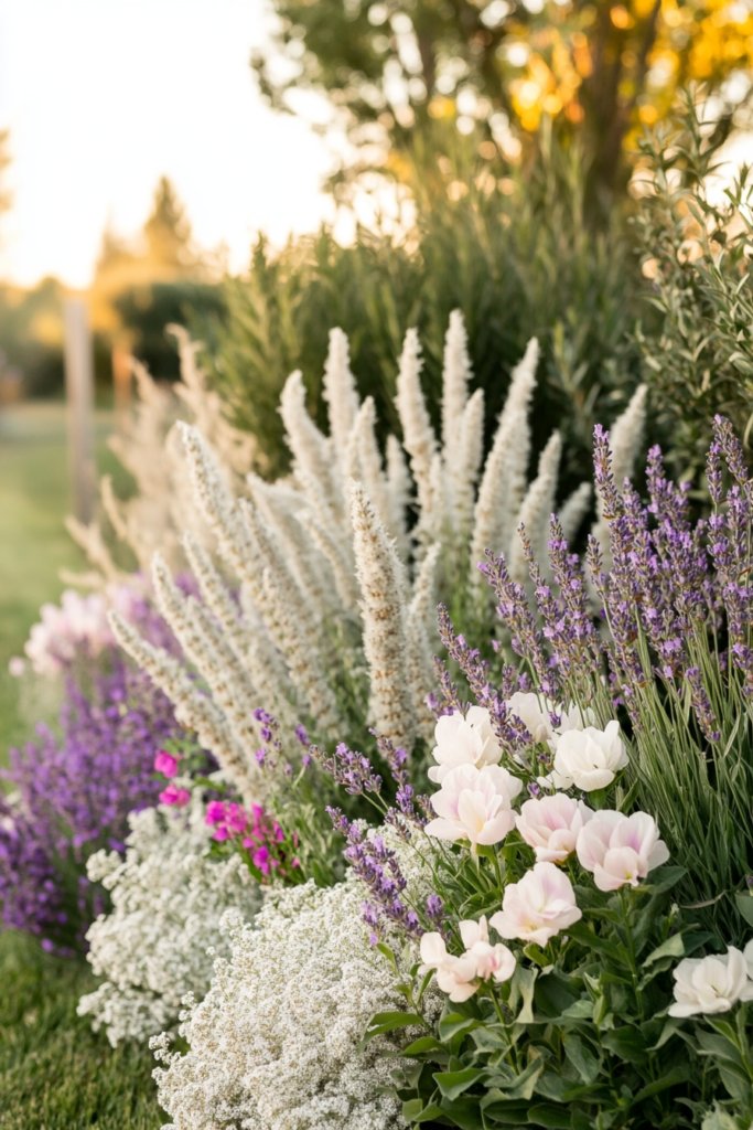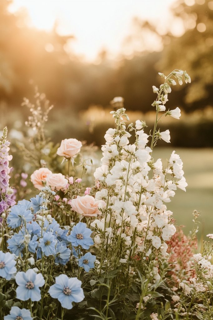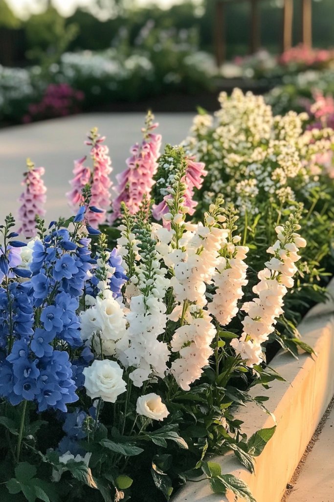 Delphiniums in soft blues and purples, pink foxgloves, white scabiosa, and romantic garden roses create a dreamy, cottage-style display. The flowers sway gently in the breeze as warm golden sunlight filters through. To bring this look to life, plant tall, delicate blooms in loose clusters, allowing them to grow naturally for a free-flowing, fairytale-like setting.