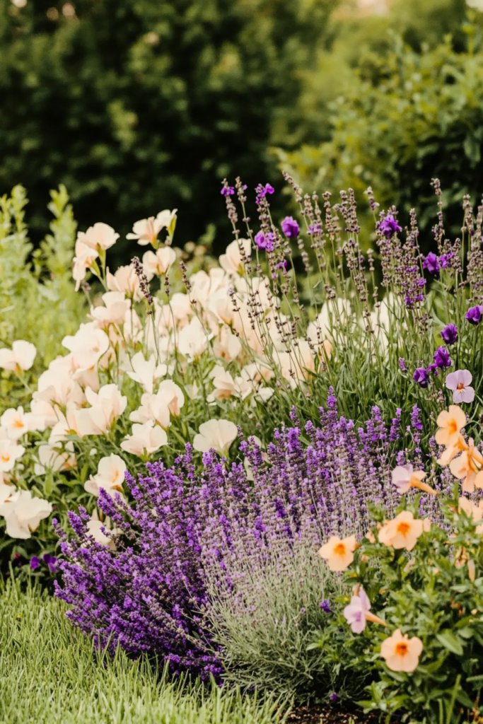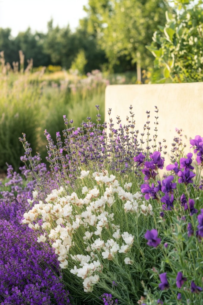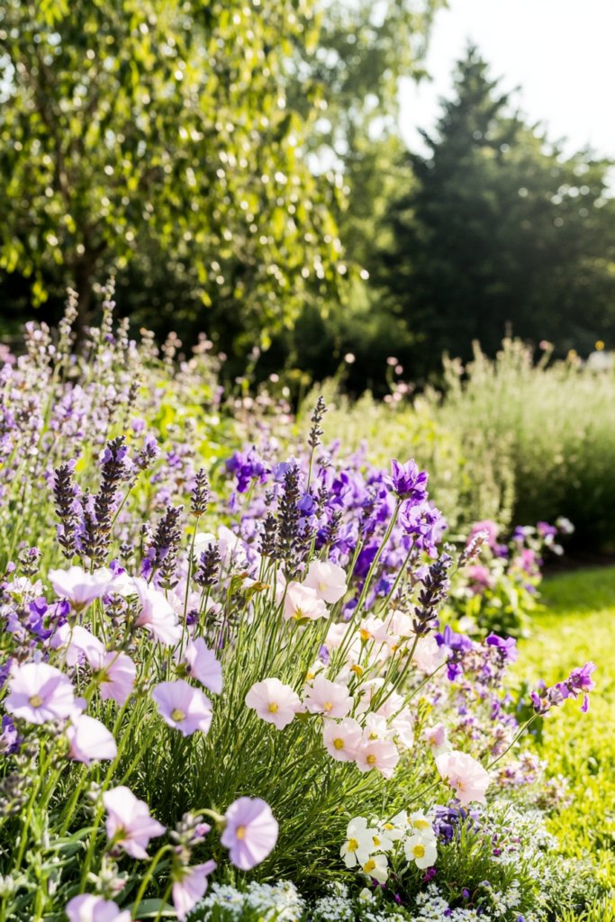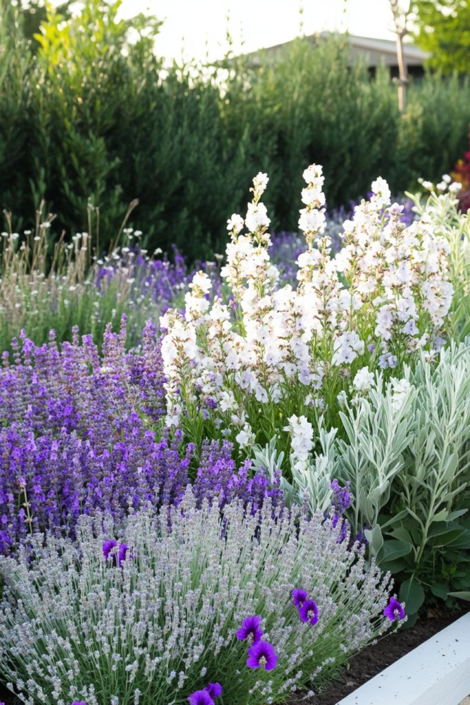 A serene garden bed filled with lavender, pale purple scabiosa, deep violet sweet peas, and amethyst-hued larkspur creates a calming, dreamlike display. The cool-toned blooms are accentuated by soft daylight, making the garden feel tranquil and elegant. To replicate this look, plant in well-draining soil and arrange flowers in soft, flowing clusters.