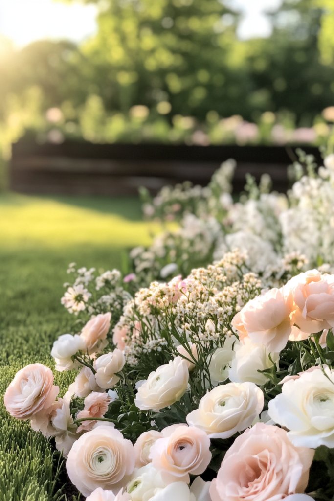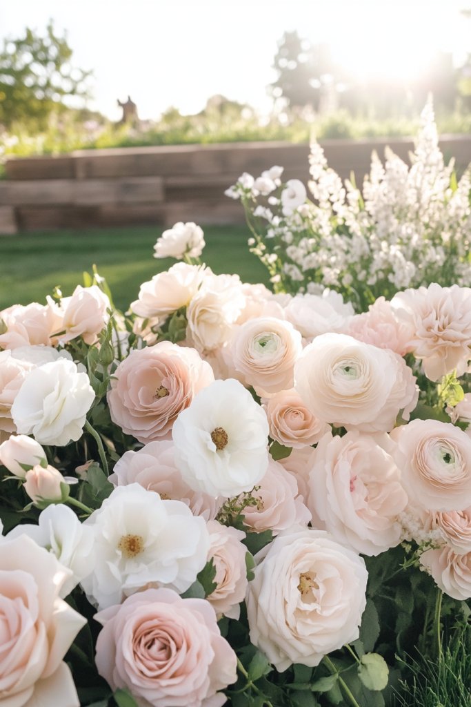 A romantic collection of pale pink ranunculus, champagne roses, soft white cosmos, and feathery astilbe creates a delicate, airy aesthetic. Sunlight filters through the petals, making them appear almost translucent. A rustic wooden garden edge enhances the charm. For a similar look, select soft blush flowers and plant in loose, natural clusters.