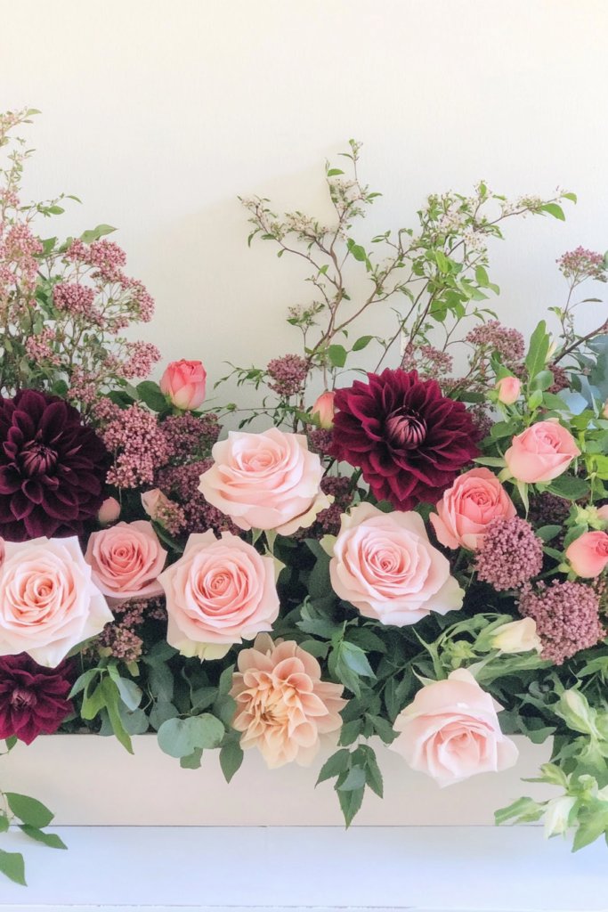 Dusty pink roses, burgundy dahlias, deep red ranunculus, and antique mauve scabiosa create a vintage-inspired, romantic garden bed. The soft evening light enriches the moody yet delicate color palette. To recreate this look, layer soft pinks with deep reds and use rich, organic soil for healthy, full blooms.