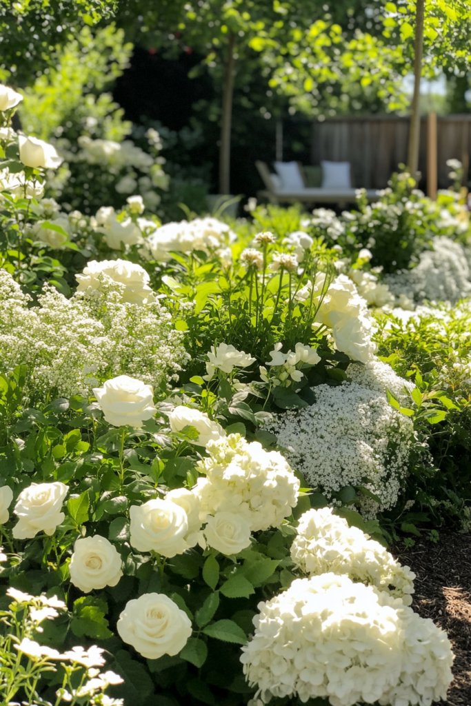 A sophisticated display of white roses, Queen Anne’s lace, snow-white cosmos, and fluffy hydrangeas creates a classic, refined garden bed. Sunlight filtering through the foliage casts soft shadows that add depth. To achieve this look, focus on lush, full blooms in different heights, paired with soft green accents for an airy, elegant touch.