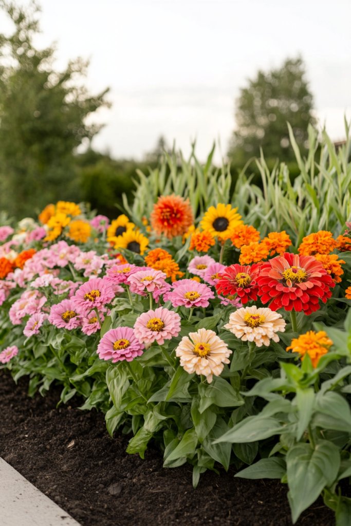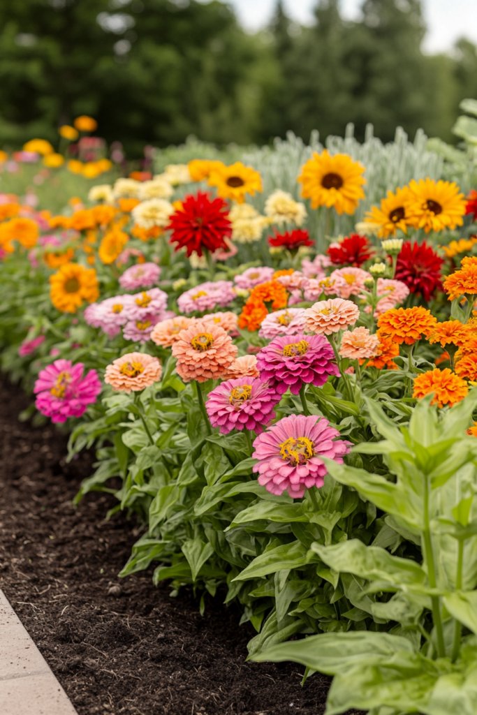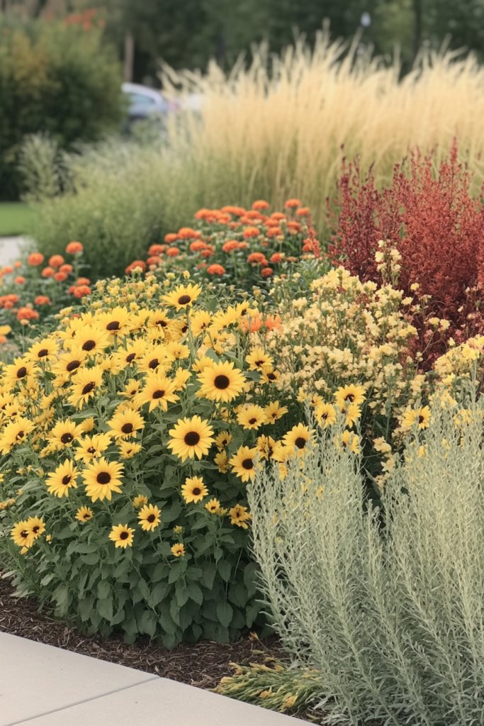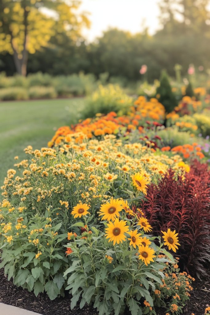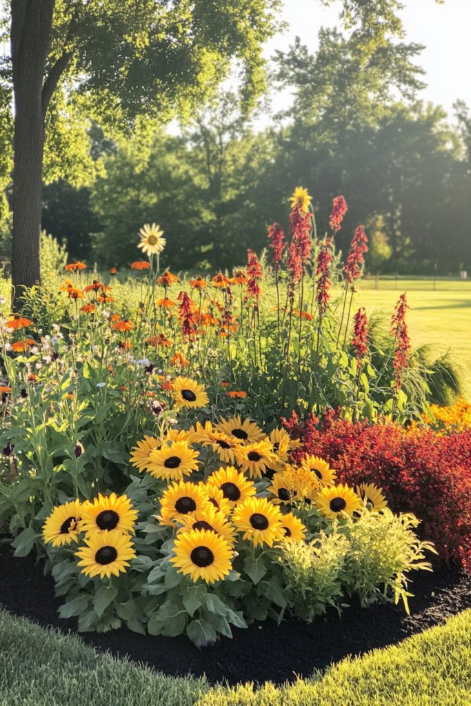 A sun-drenched bed of mustard-yellow rudbeckia, golden sunflowers, burnt-orange marigolds, and deep red celosia radiates warmth in the late-summer glow. The vibrant hues thrive under full sun, creating a lush, seasonal spectacle. For a similar effect, plant a mix of tall sunflowers and shorter companion blooms to create a layered, glowing display.