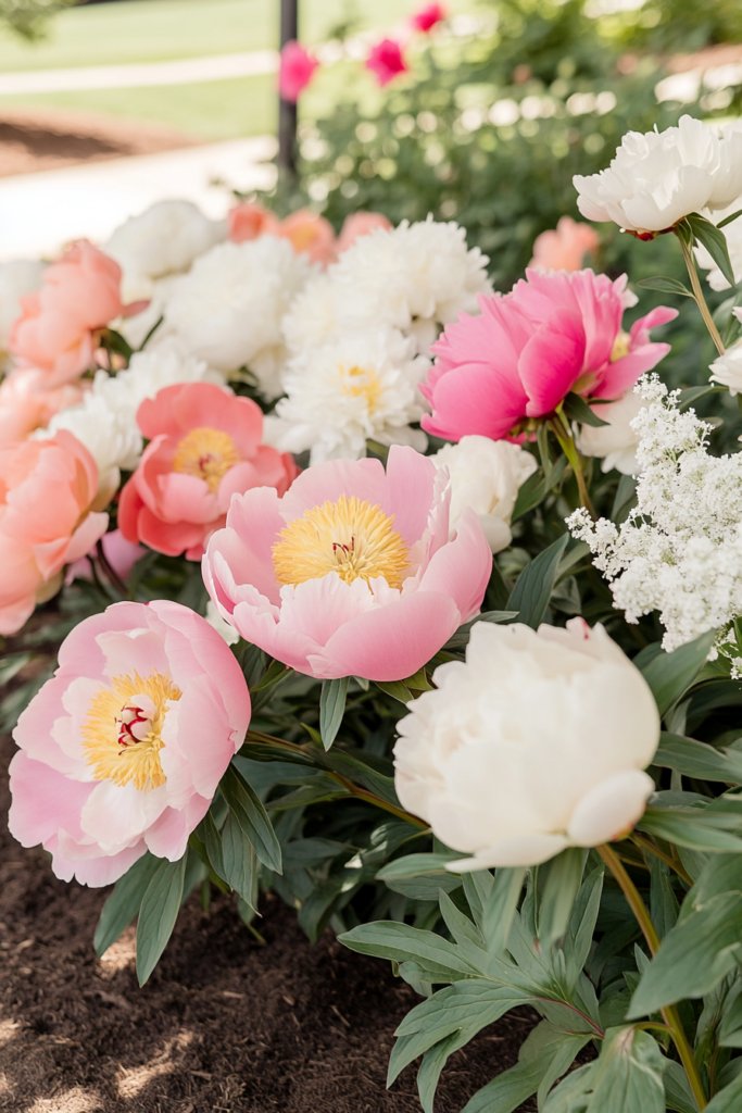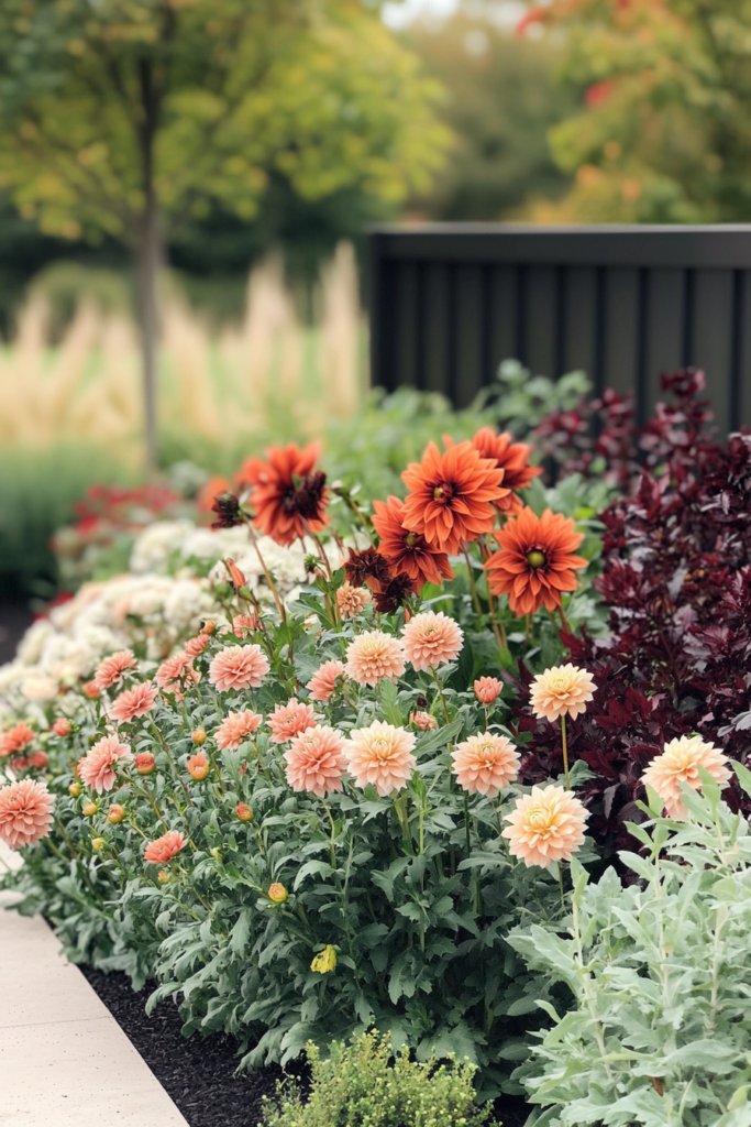 This romantic flower bed is filled with oversized blush pink , creamy white dahlias, and airy ivory astilbe. The soft, diffused sunlight highlights their delicate textures, creating a dreamy, luxurious garden. For this look, choose full, ruffled blooms and plant them in nutrient-rich soil with ample moisture to encourage lush growth.