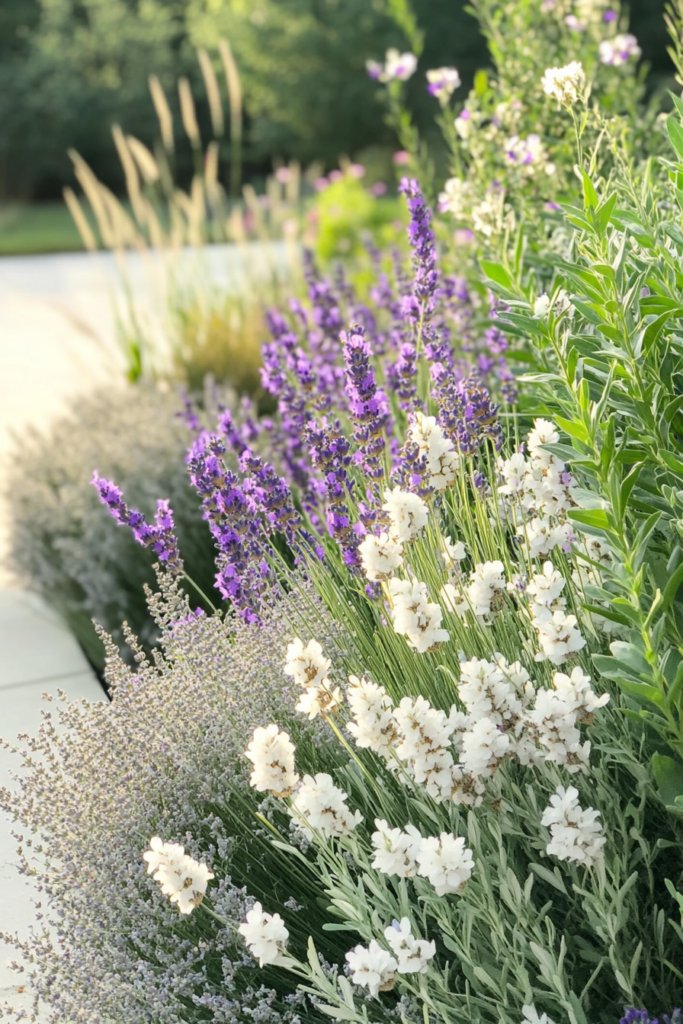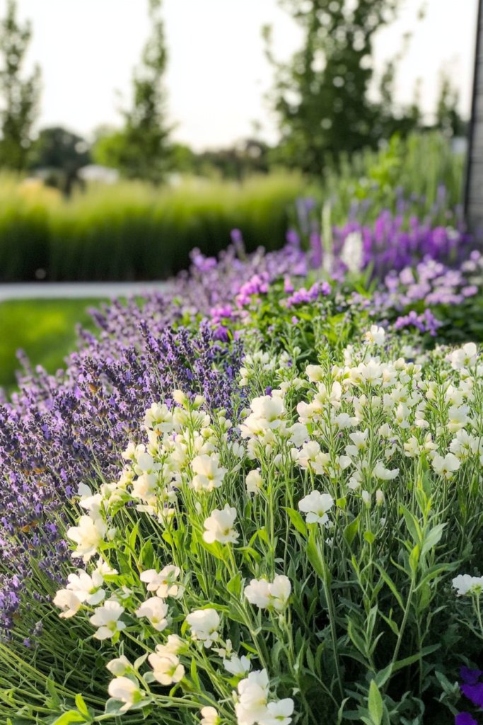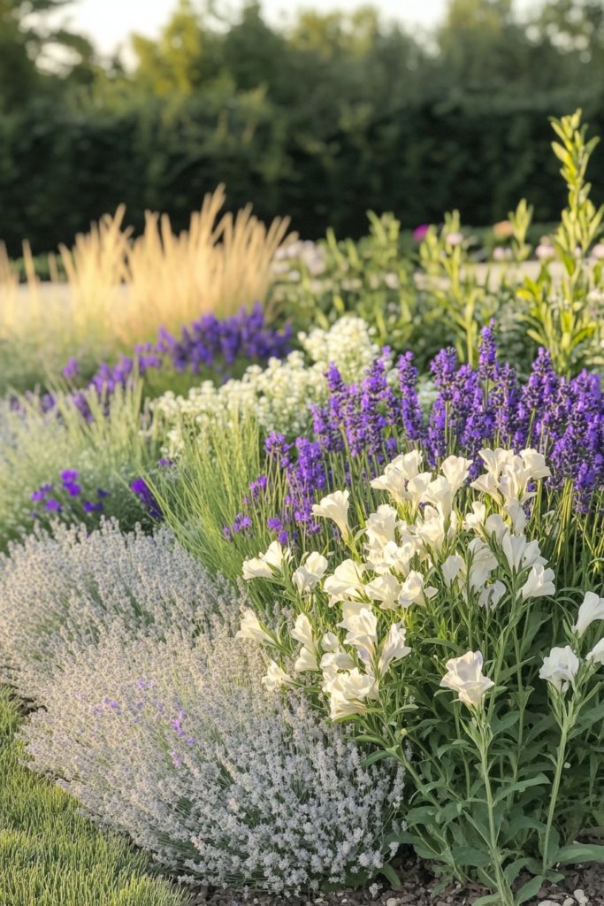 A soothing mix of lavender, dusty miller, pale purple scabiosa, and ivory snapdragons gives this garden a soft, muted beauty. Silvery-green foliage complements the cool-toned blooms, creating a tranquil retreat. To recreate this look, focus on plants with soft textures and cool, desaturated hues for a calming effect.