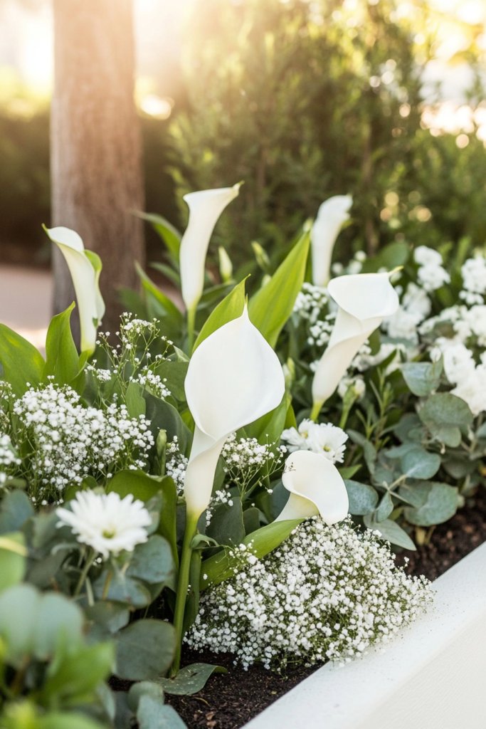 A sleek and modern floral bed, this arrangement features crisp white calla lilies, delicate baby’s breath, snow-white cosmos, and lush eucalyptus. The soft, diffused sunlight enhances the clean aesthetic, offering a fresh, minimalist charm. To achieve this look, focus on simple, elegant blooms and incorporate greenery for contrast and movement.