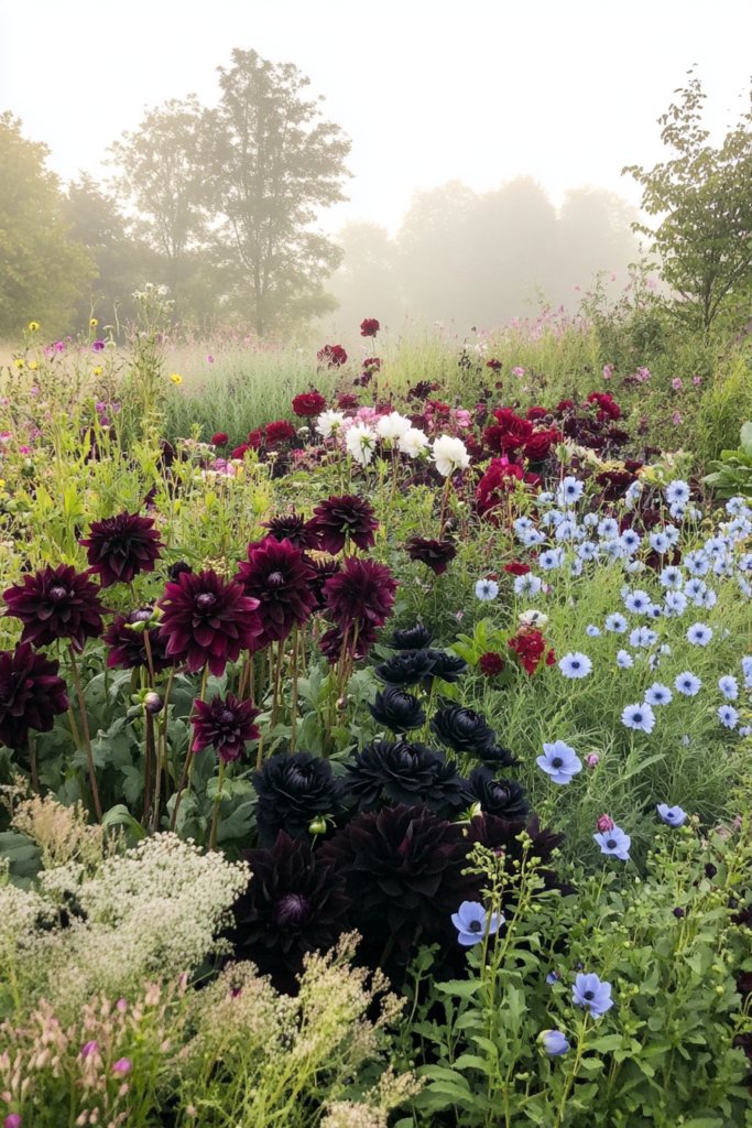 With a mysterious yet refined palette, this flower bed features dark dahlias, midnight anemones, rich ranunculus, and red snapdragons. The soft, diffused daylight enhances the velvety textures. To replicate this garden, opt for rich, saturated colors and plant in slightly shaded areas to deepen the moody effect.