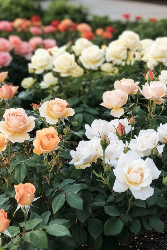 This timeless rose garden bursts with romance, featuring fragrant blooms in blush pink, creamy white, warm apricot, and deep red. The velvety petals glow under the sunlight, contrasted by lush, dark green foliage. To create this look, select disease-resistant rose varieties suited for cutting and plant them in well-draining soil with full sun exposure. Regular pruning encourages continuous blooms, while deep mulching keeps the roots healthy.