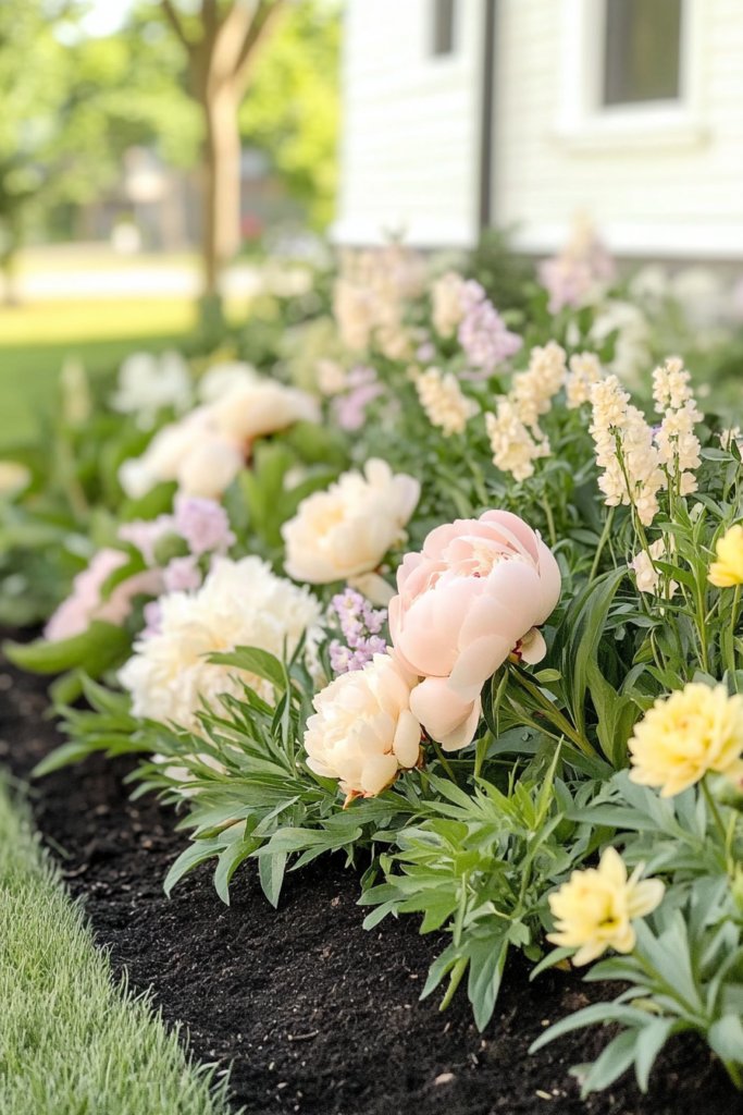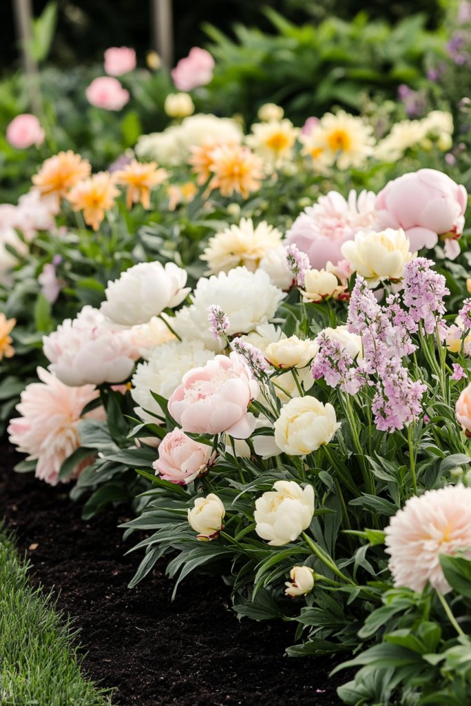 This lush flower bed overflows with pastel-toned blooms, including blush pink peonies, pale lavender sweet peas, ivory ranunculus, and buttery yellow dahlias. Morning sunlight casts a gentle glow over the delicate petals, creating an enchanting scene. To achieve this romantic look, blend soft pastel hues and layer flowers for a natural, overflowing effect.