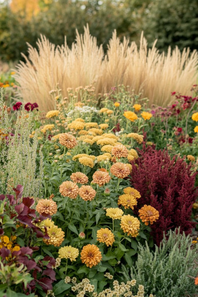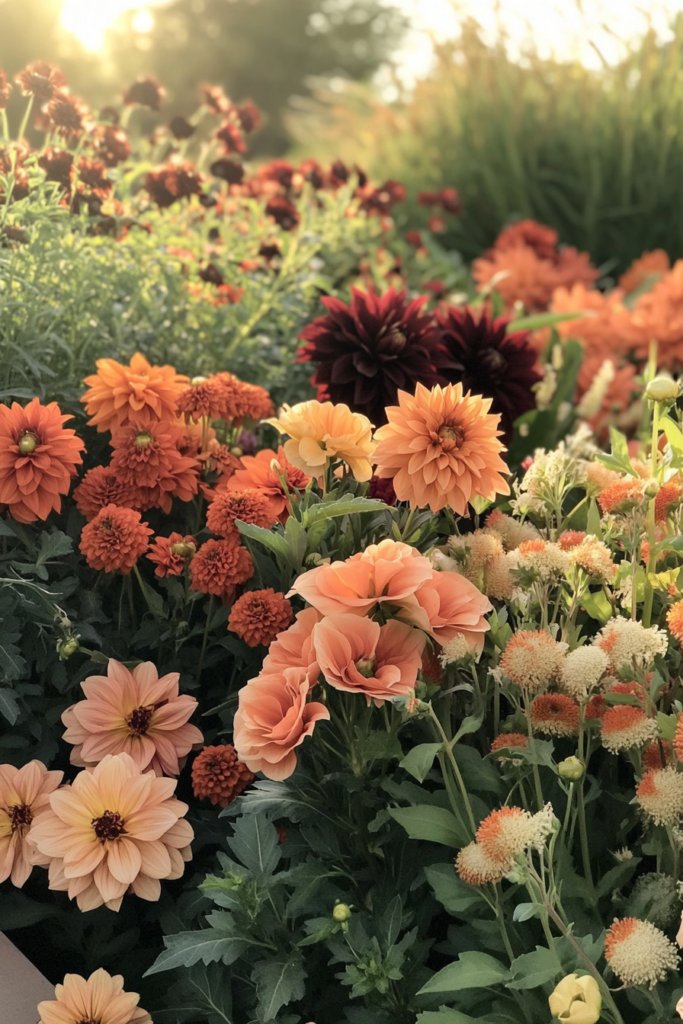 A warm and cozy mix of rust-colored chrysanthemums, terracotta zinnias, golden yarrow, and deep crimson celosia brings an earthy autumnal feel. The textured petals catch the golden autumn sunlight. To mirror this look, plant warm-toned florals in a loosely structured arrangement and let them blend naturally for a rustic charm.