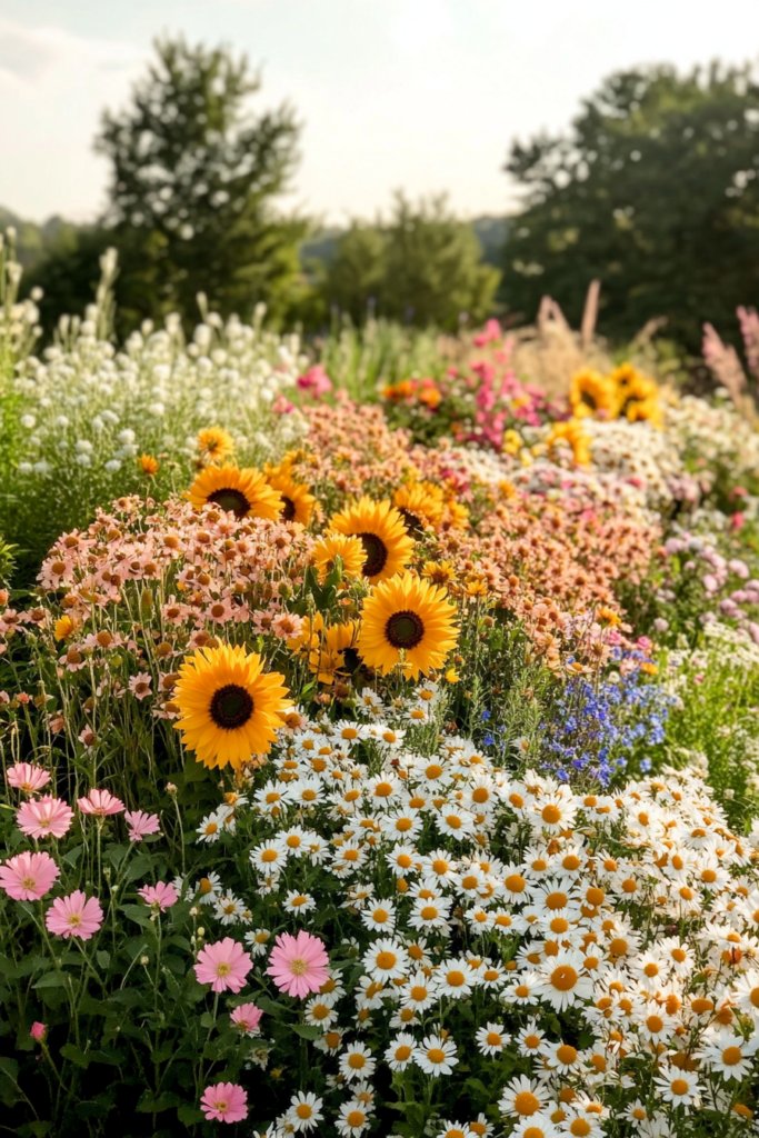 This energetic cut flower garden is packed with hot pink zinnias, golden sunflowers, fiery red celosia, and electric orange marigolds. Bright daylight enhances the vivid hues, while crisp green stems provide contrast. To create a similar effect, choose bold, high-impact blooms and arrange them in a wild, unstructured layout for a lively, summer-inspired look.