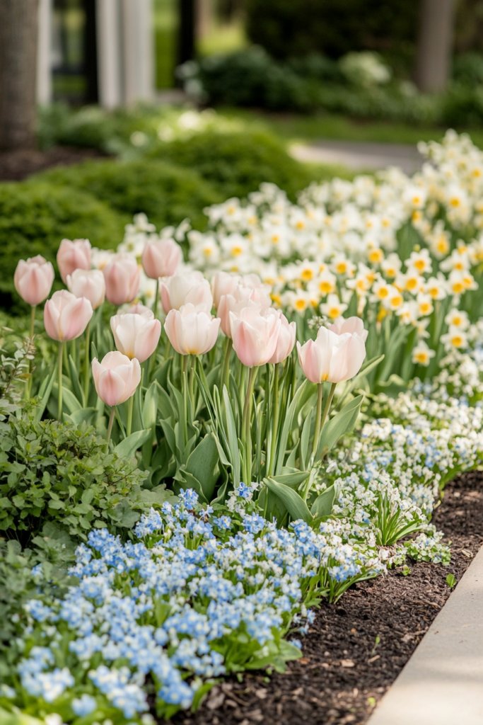A pastel dream, this spring garden flourishes with soft pink , creamy white narcissus, pale yellow ranunculus, and baby blue forget-me-nots. The light, airy feel is enhanced by natural daylight. To achieve this look, plant early-blooming bulbs and delicate florals in well-spaced drifts for a soft, ethereal effect.