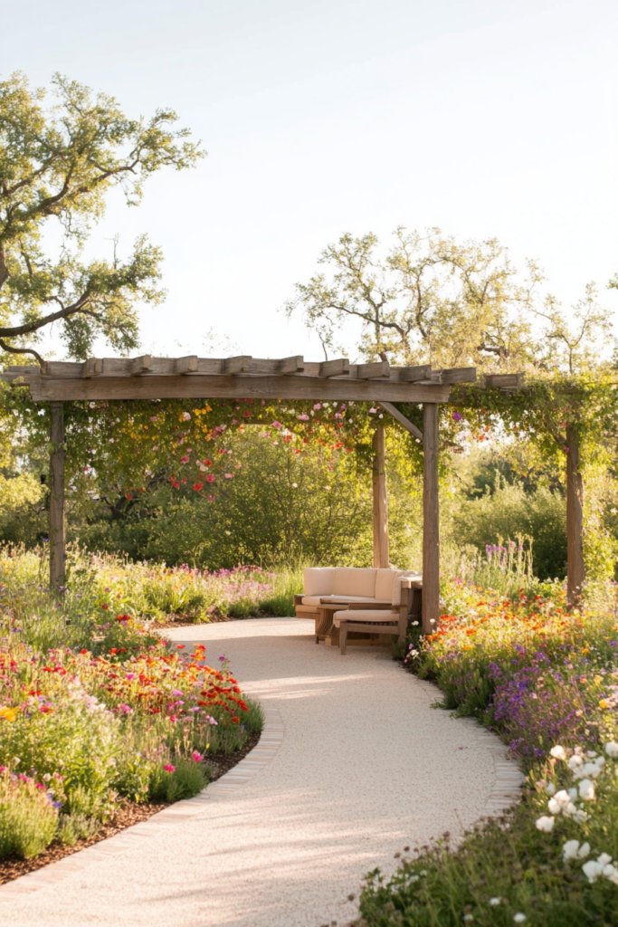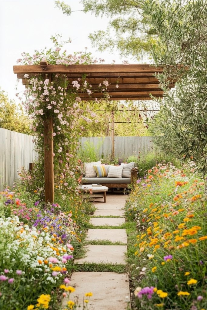A lush wildflower space featuring a wooden trellis draped in flowering vines, winding pathways, and a hidden seating nook. Create this dreamy setting with climbing plants, natural stone paths, and tucked-away resting spots.