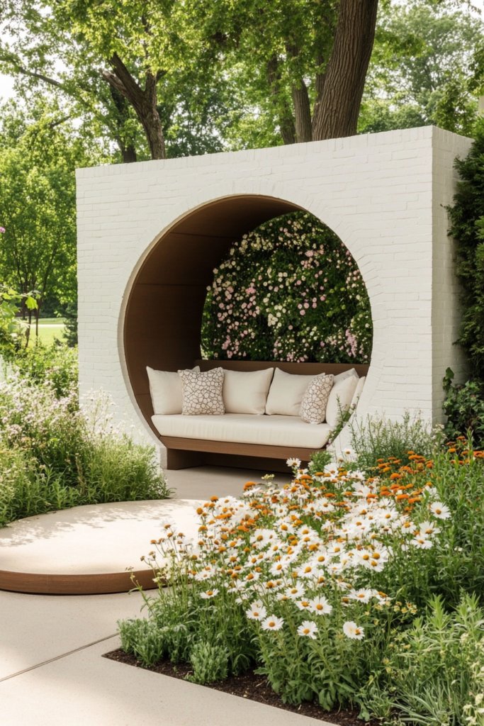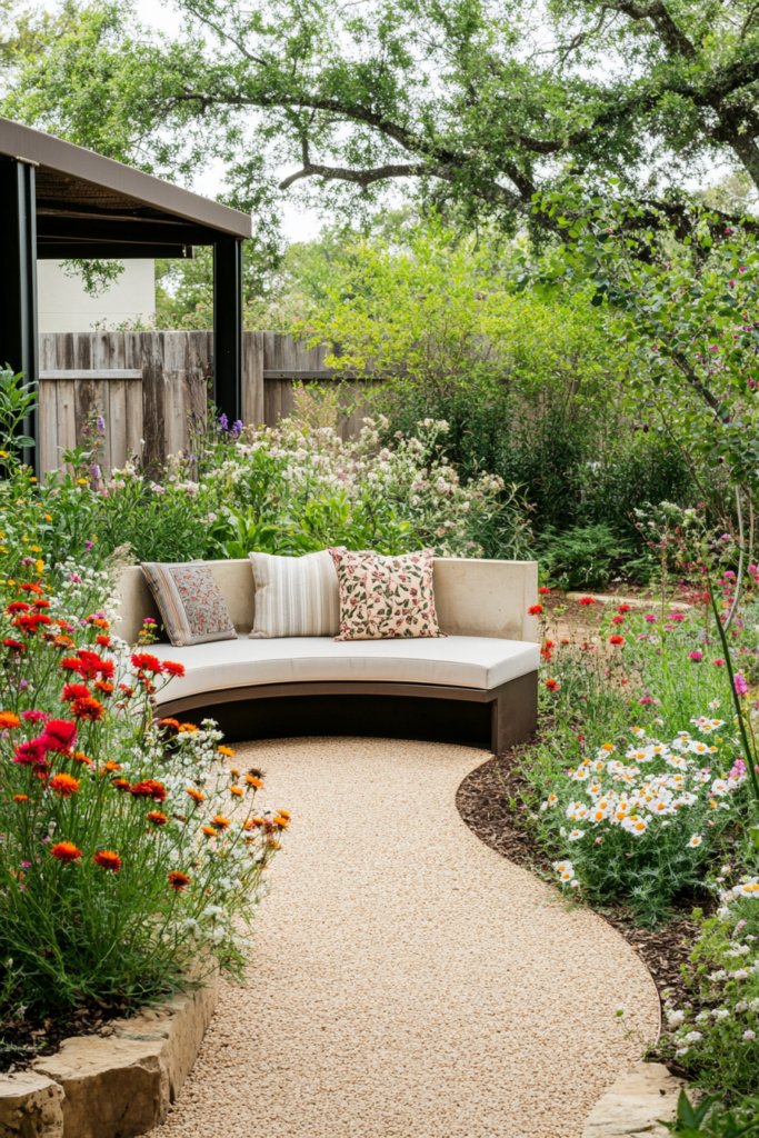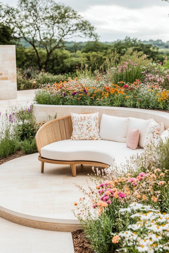 A circular seating nook is framed by vibrant native blooms in natural clusters. Soft earthy tones and an organic design create a tranquil space. Achieve this aesthetic with curved forms, neutral palettes, and structured wildflower beds.