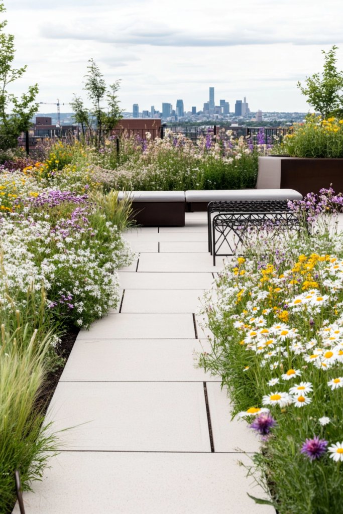A modern escape with clean geometric pathways, sleek metal seating, and structured yet natural wildflower arrangements. The city skyline adds contrast. Recreate this with contemporary furniture, intentional plant groupings, and an urban edge.