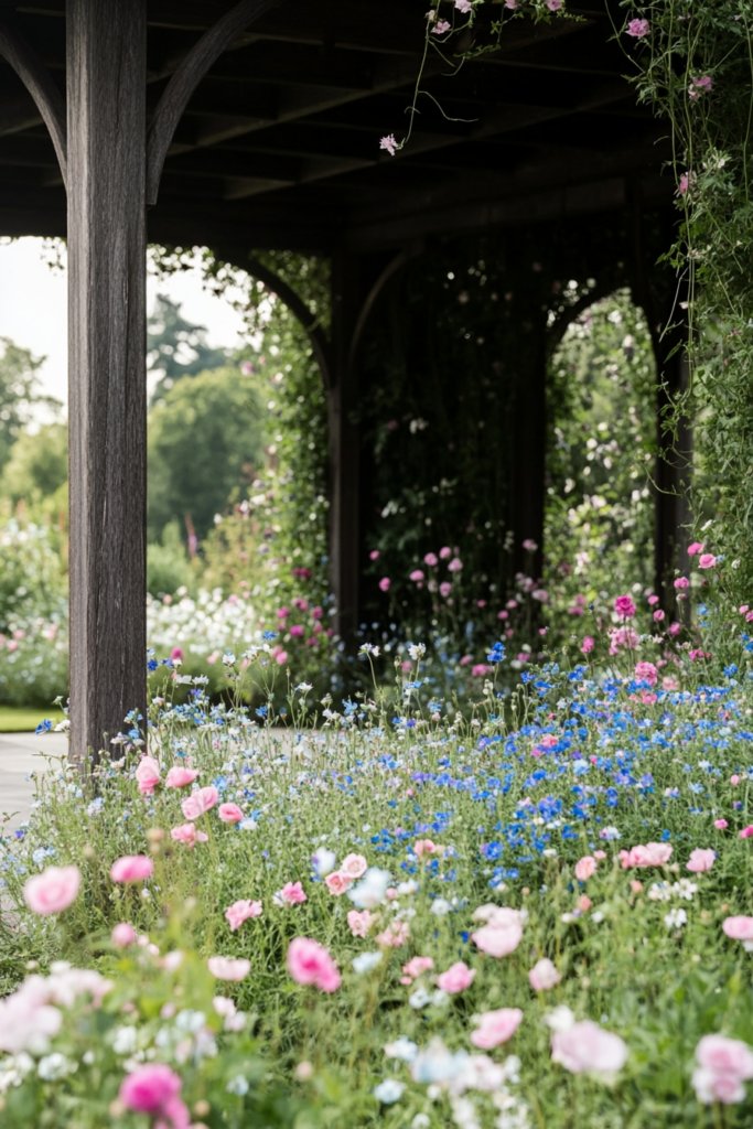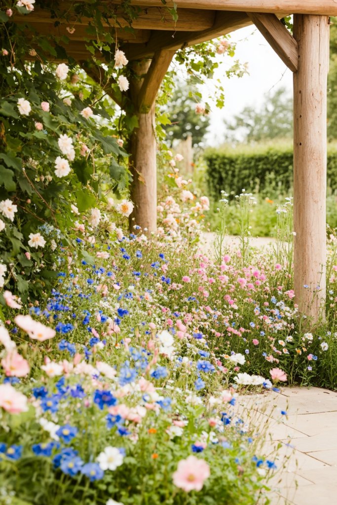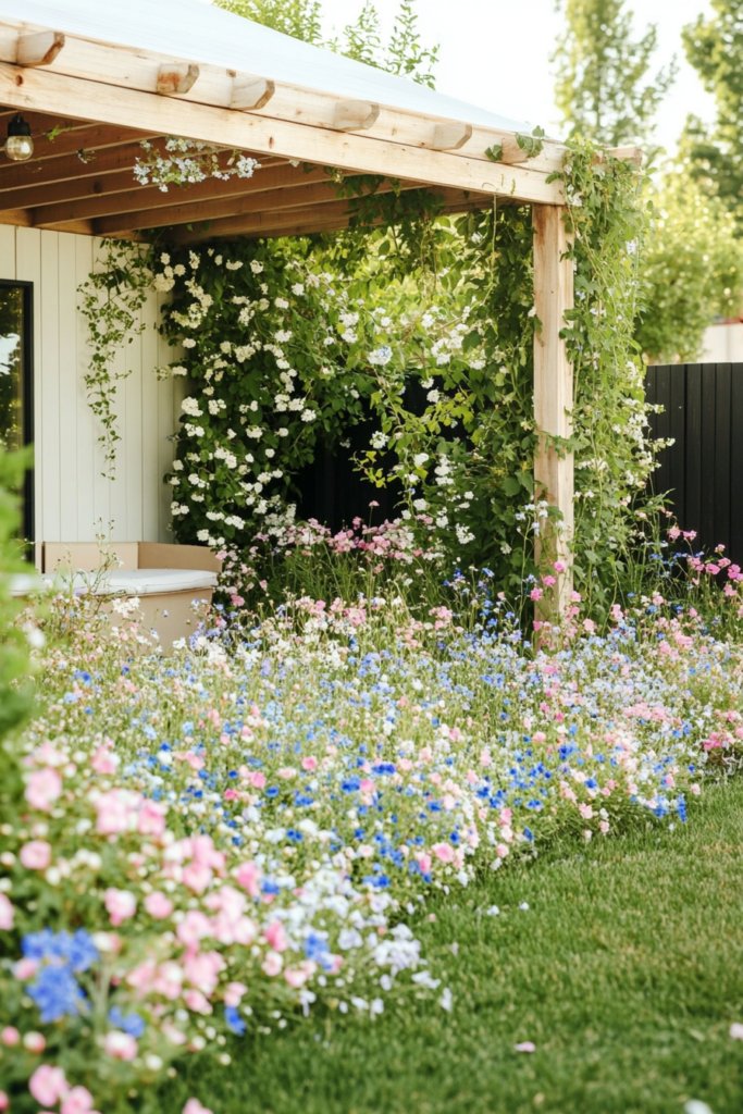 A tucked-away corner under a wooden pergola, adorned with climbing vines and soft pink, blue, and white blooms. This intimate space exudes romance. Achieve the effect with trellises, pastel wildflowers, and natural wood for a serene retreat.