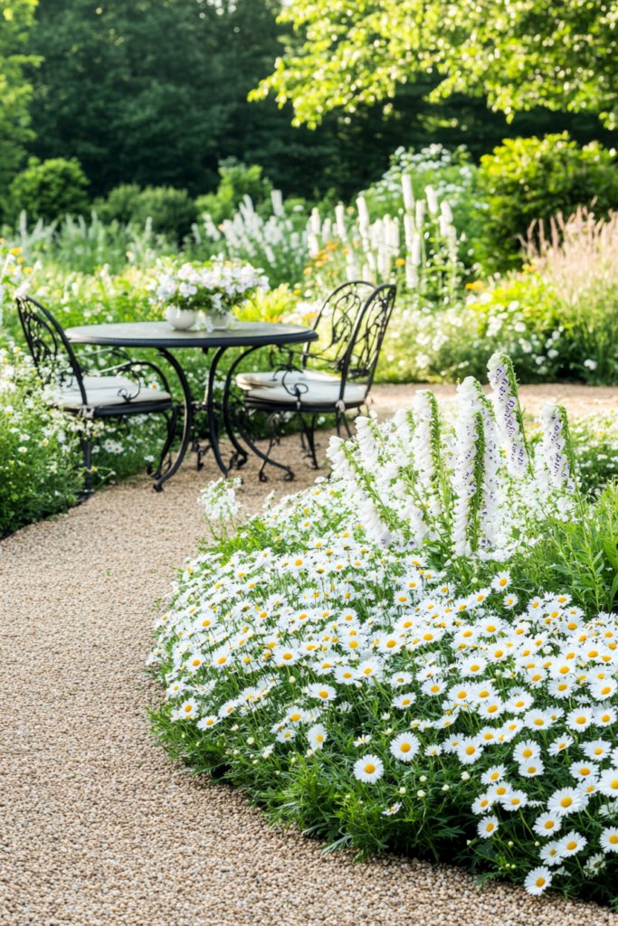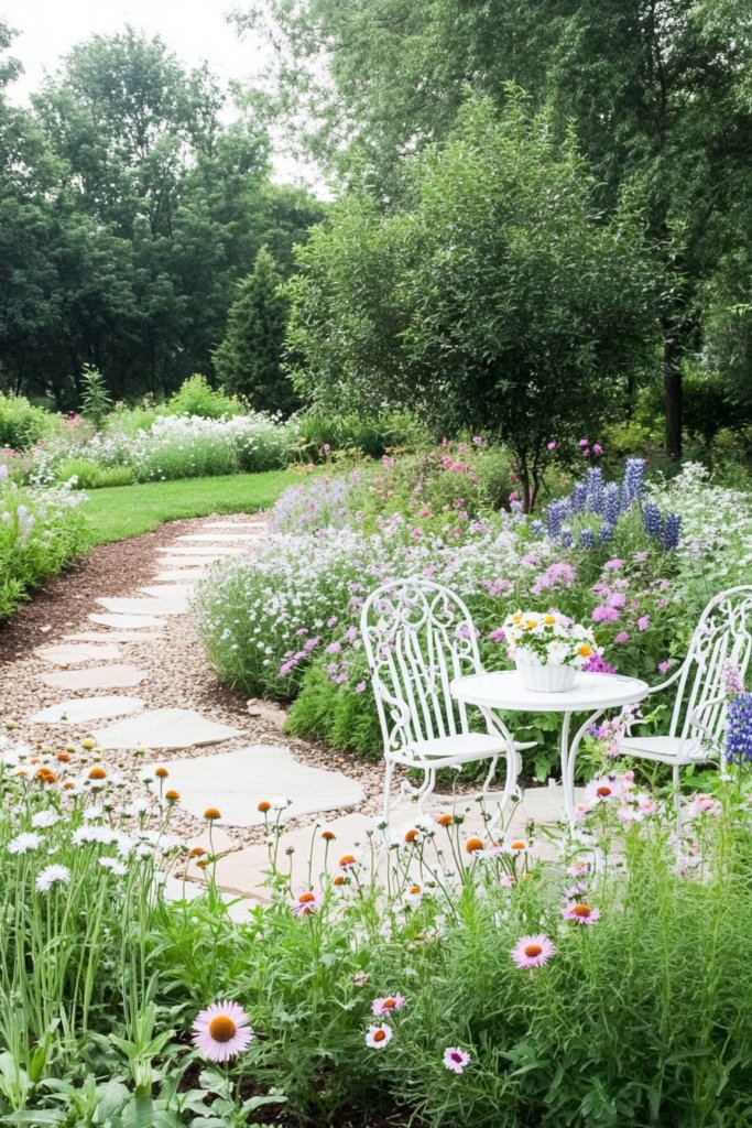 A romantic setting with a white-painted iron bistro set nestled among coneflowers, lupines, and cornflowers. A stone pathway leads to a shaded retreat. Achieve this look with soft floral colors and vintage-inspired outdoor furniture.