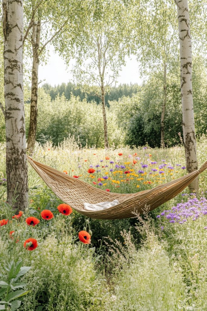 A woven hammock swings between trees, surrounded by red poppies, purple echinacea, and yellow coreopsis. Earthy tones and natural textures create a relaxed atmosphere. Recreate this with boho-style accents and bold wildflowers.