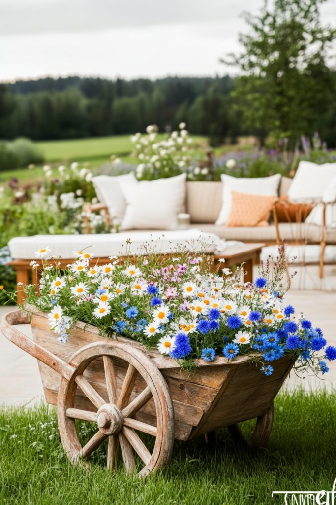 A rustic wooden wheelbarrow overflows with cosmos, daisies, and blue cornflowers, creating a charming focal point. Cozy seating nearby invites relaxation. Achieve this look with repurposed garden decor and colorful, free-flowing blooms.