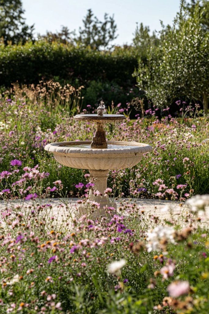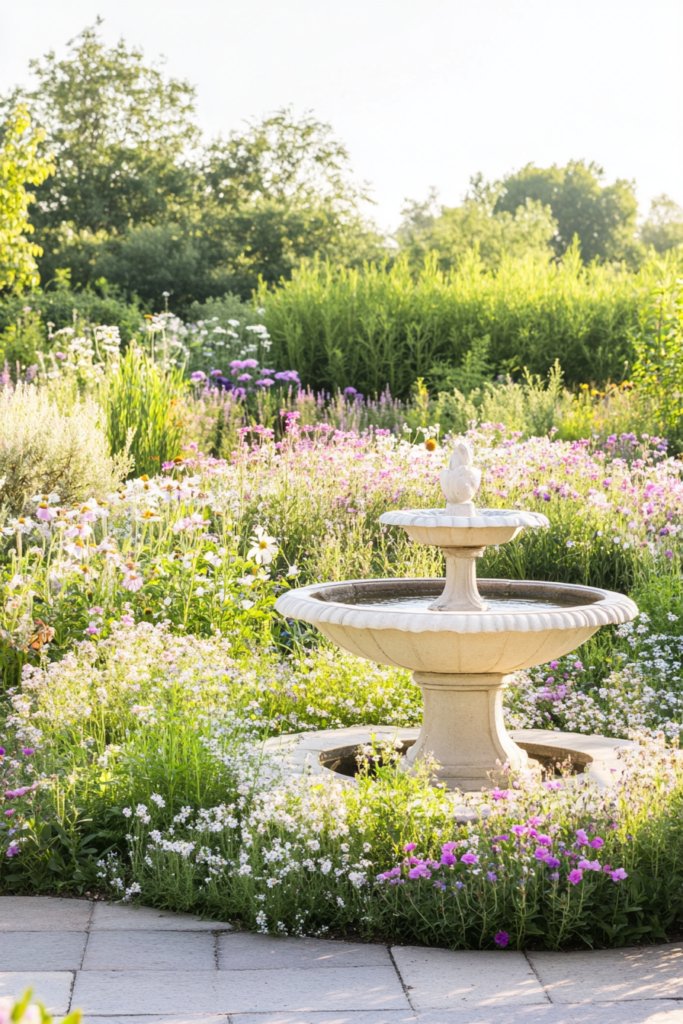 A graceful stone fountain takes center stage, surrounded by delicate pink and purple blossoms. Warm sunlight enhances the tranquil charm. To bring this to life, incorporate a classic water feature and plant a mix of soft-colored blooms for a timeless aesthetic.