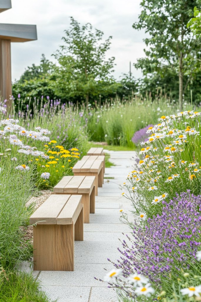 Simple wooden benches rest among soft lavender, Queen Anne’s lace, and daisies, surrounded by tall wild grasses. A calming, Zen-inspired atmosphere emerges. Capture this feel with restrained plant choices and uncluttered, natural seating.