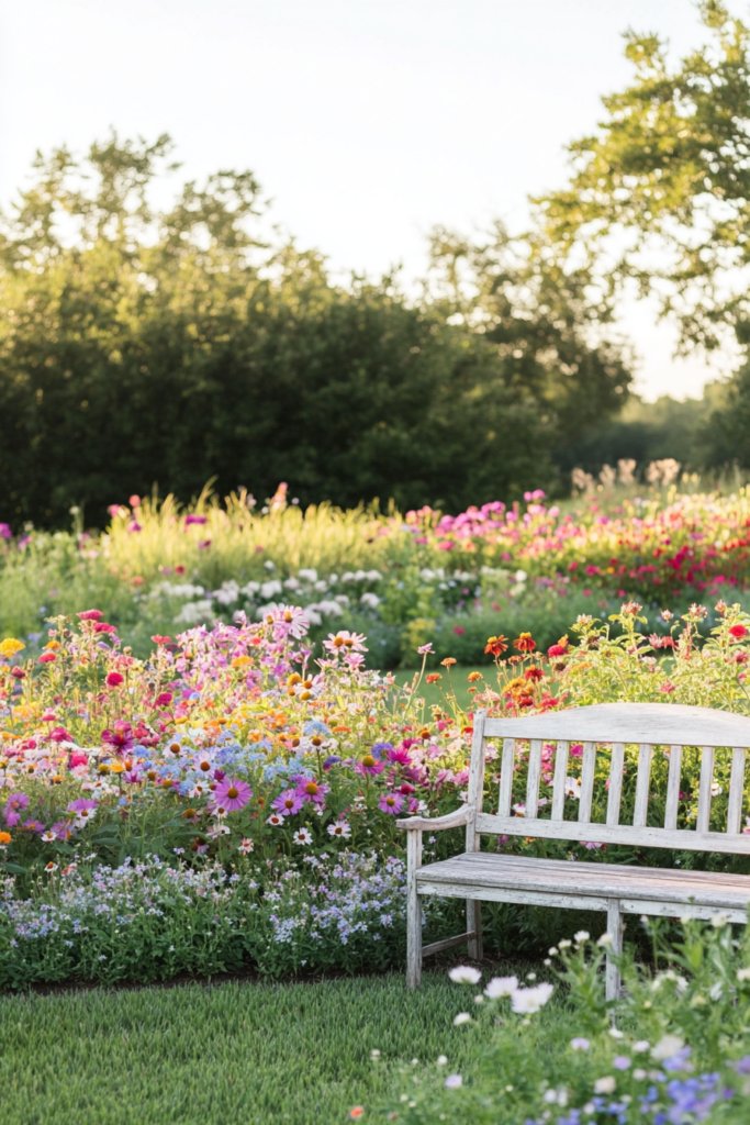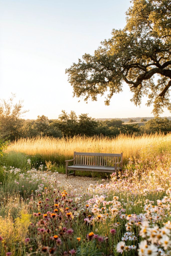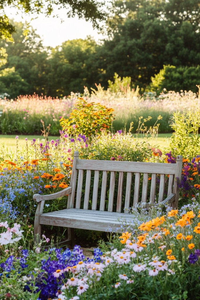 A refined wildflower garden blending native and exotic blooms, with a vintage wooden bench offering a quiet escape. A warm late-afternoon glow completes the scene. Achieve this by layering different plant heights and adding classic garden seating.