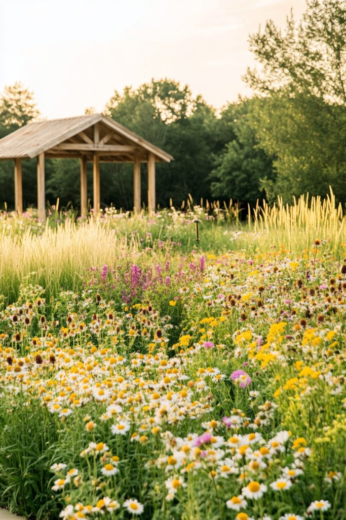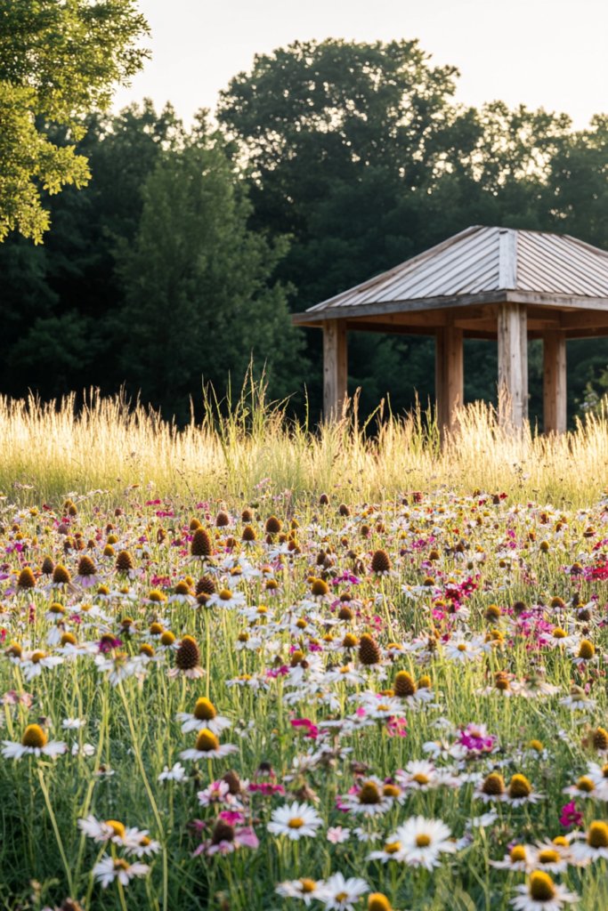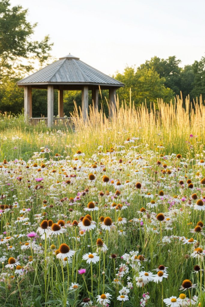 A sprawling meadow with a rustic wooden gazebo at its heart, surrounded by vibrant coneflowers, daisies, and tall grasses. Soft golden light enhances the scene. To recreate, use natural wood structures and plant in abundant, flowing layers.