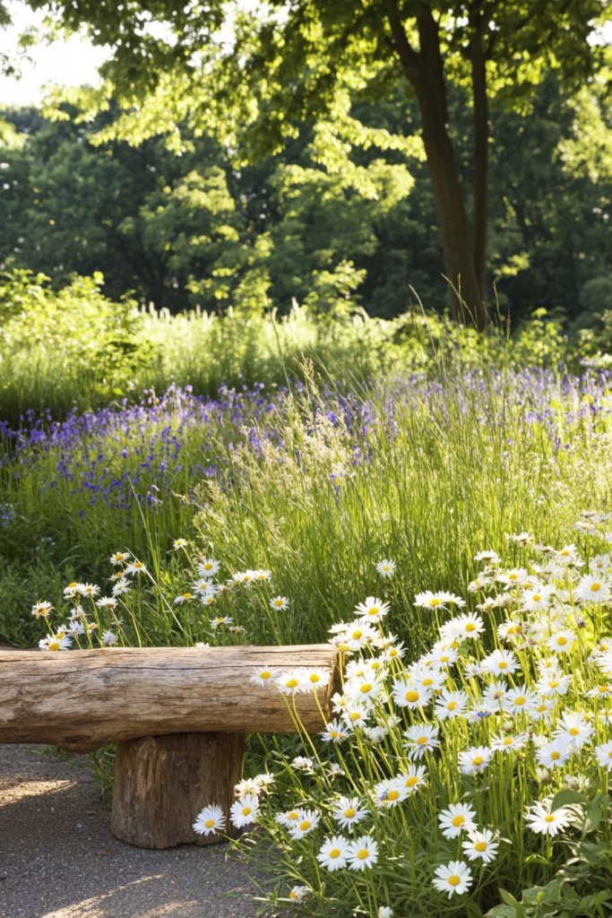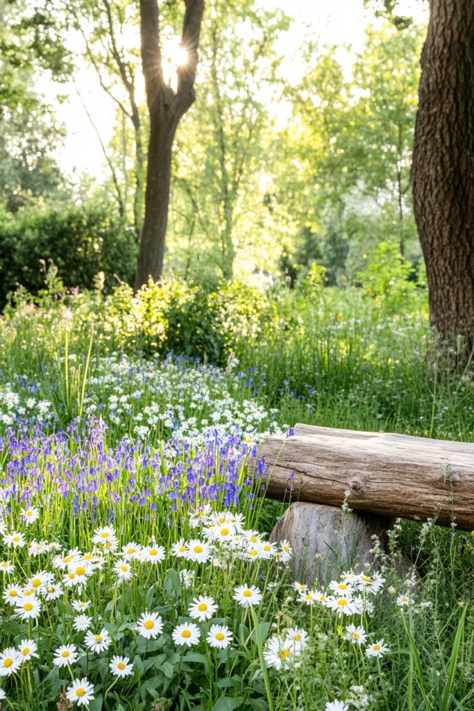 A serene, rustic space with a log bench nestled among wild daisies, bluebells, and tall grasses. Dappled sunlight filters through the trees. Recreate this peaceful setting with natural wood elements and a soft, untamed planting style.