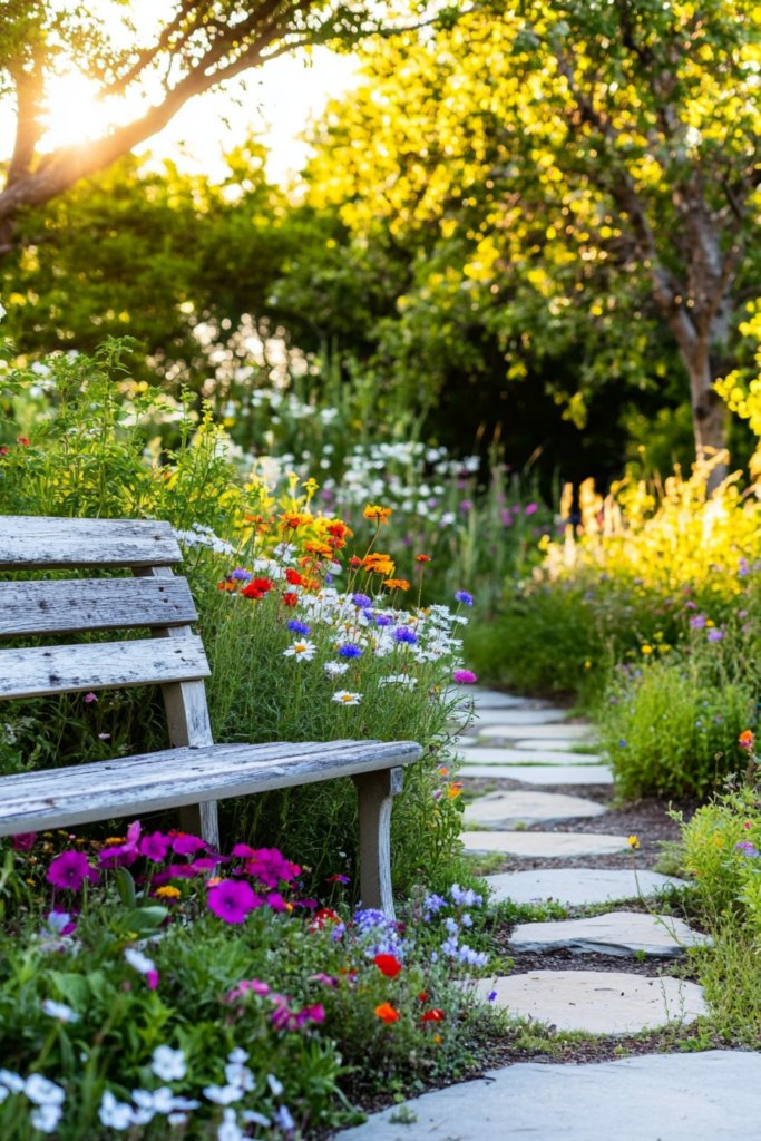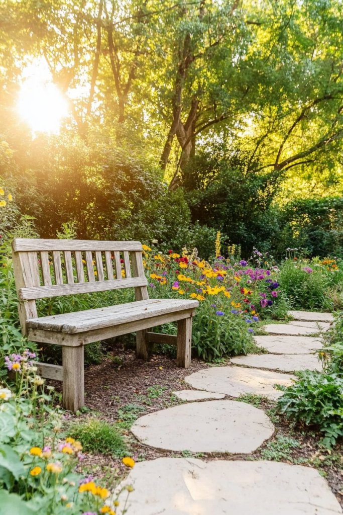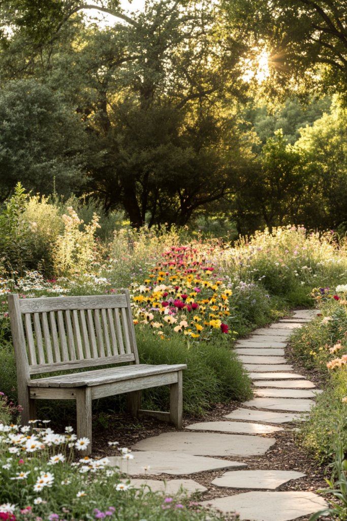 A weathered wooden bench sits among colorful native blooms swaying in the breeze. Stone pathways wind through lush greenery, golden sunlight filtering through the trees. Achieve this look with aged materials and a natural, unmanicured planting style.