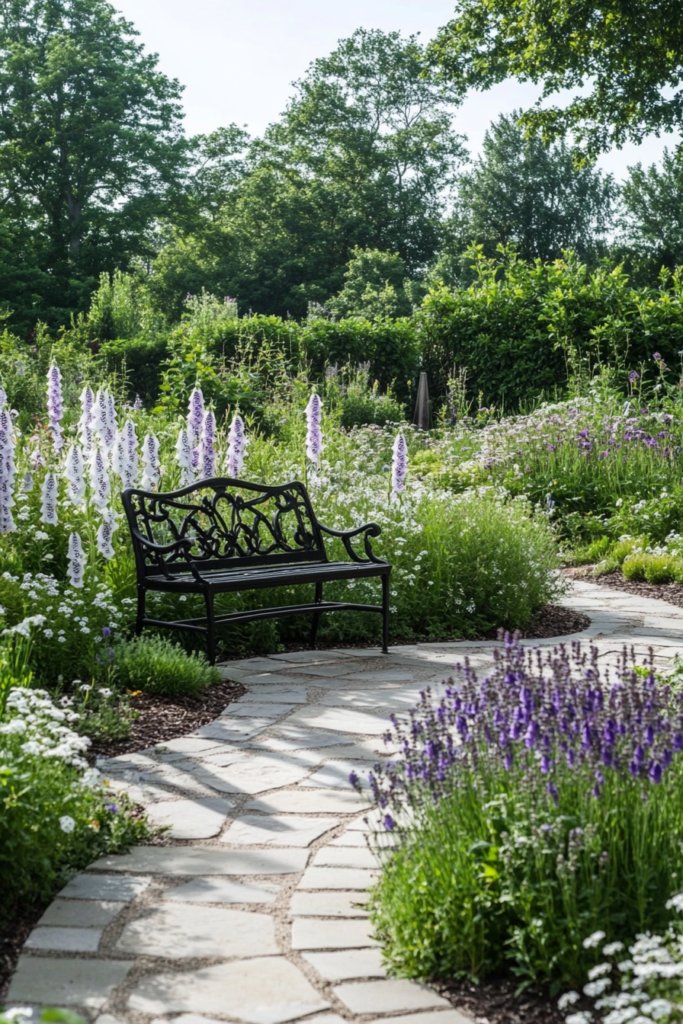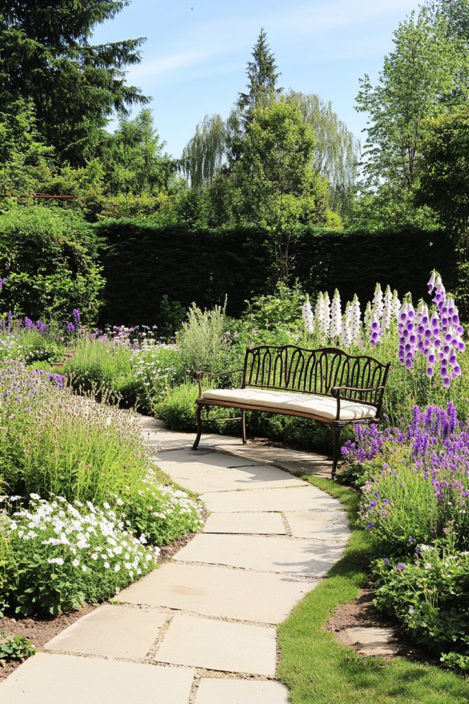 A traditional garden with winding stone paths leading to an antique wrought-iron bench. Lavender, foxgloves, and chamomile add charm. Achieve this timeless look with structured walkways and a mix of formal and wild plantings.