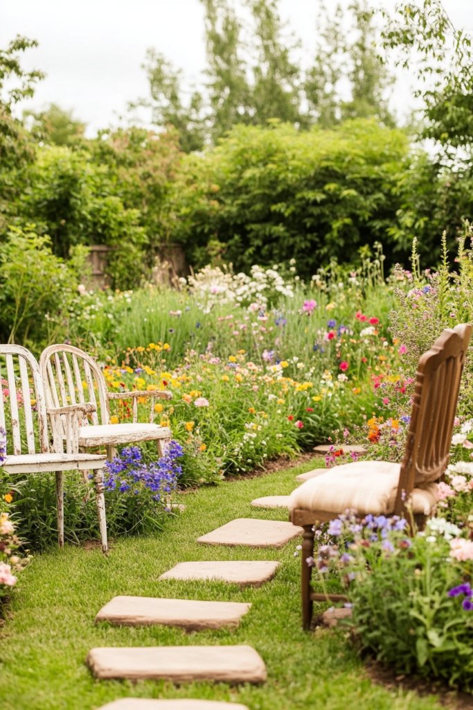 A vibrant space with mismatched vintage chairs, an eclectic mix of bright and soft wildflowers, and rustic stepping stones weaving through the flora. Relaxed boho energy flows through this garden. Recreate with layered plantings, playful seating, and organic pathways.