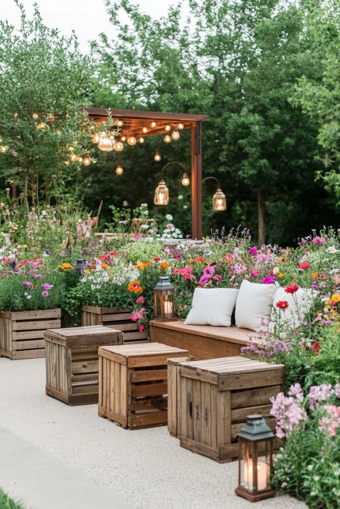 A creative retreat with upcycled wooden crate seating, colorful wildflowers, and vintage lanterns casting a cozy twilight glow. To bring this look to life, use repurposed materials and ambient lighting for a relaxed, eco-friendly vibe.