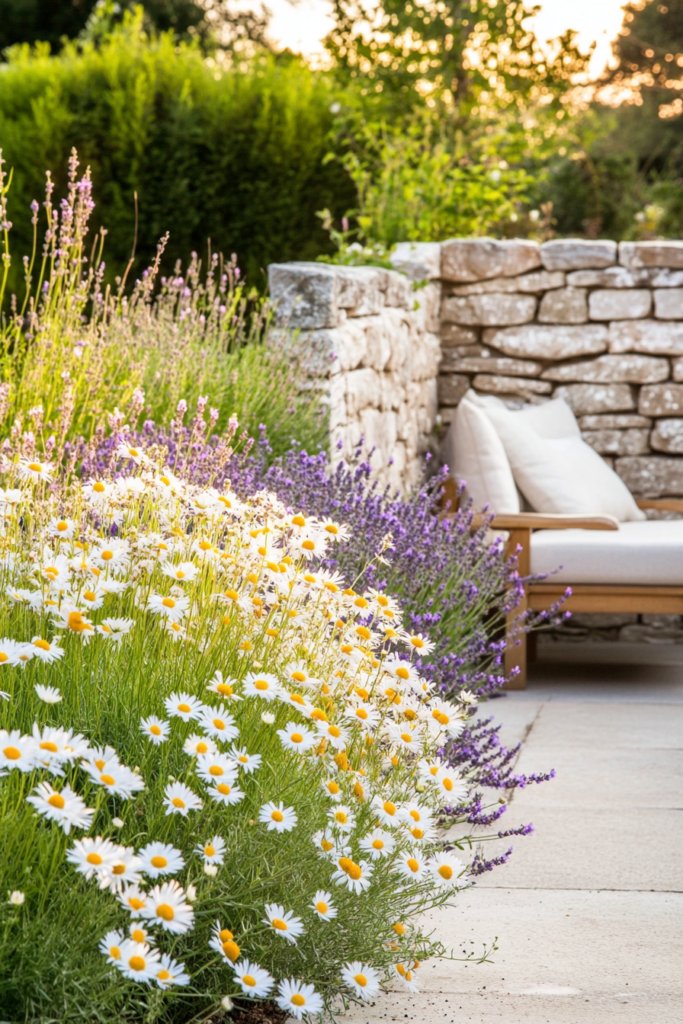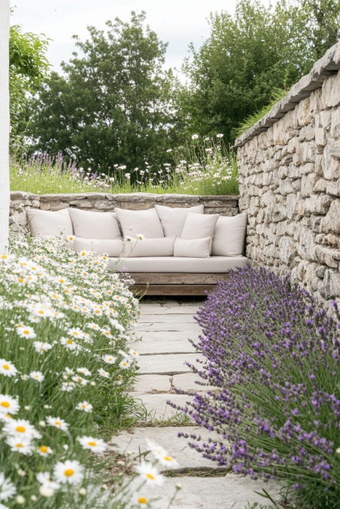 A peaceful retreat enclosed by a rustic stone wall, where daisies and lavender spill over into a cozy seating area. For a similar ambiance, use aged stone, wild-growing plants, and natural wood elements for an intimate, secret-garden feel.