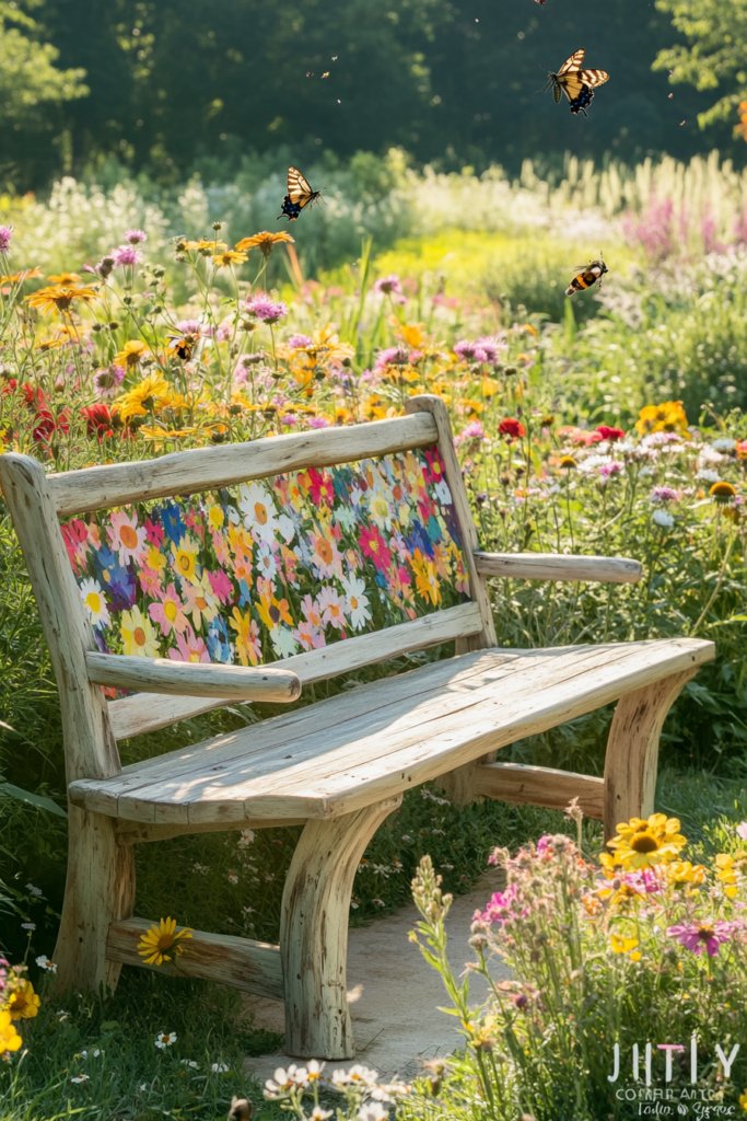 A joyful retreat with a hand-painted wooden bench surrounded by a vibrant patchwork of wildflowers. Butterflies and bees dance in the bright midday light. To create this lively setting, mix bold floral colors and add whimsical, handcrafted seating.