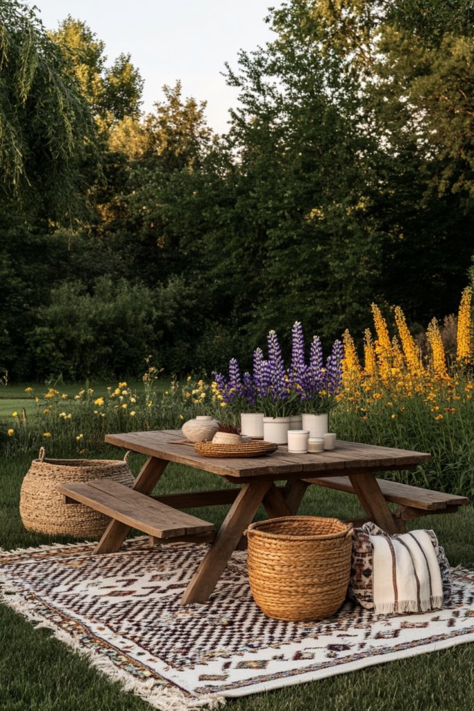 A free-spirited wildflower retreat featuring a rustic wooden picnic table surrounded by vibrant lupines and goldenrod. Patterned rugs and woven baskets create a cozy, eclectic charm. Achieve this look with natural wood elements, vintage textiles, and a mix of bold and muted floral hues.
