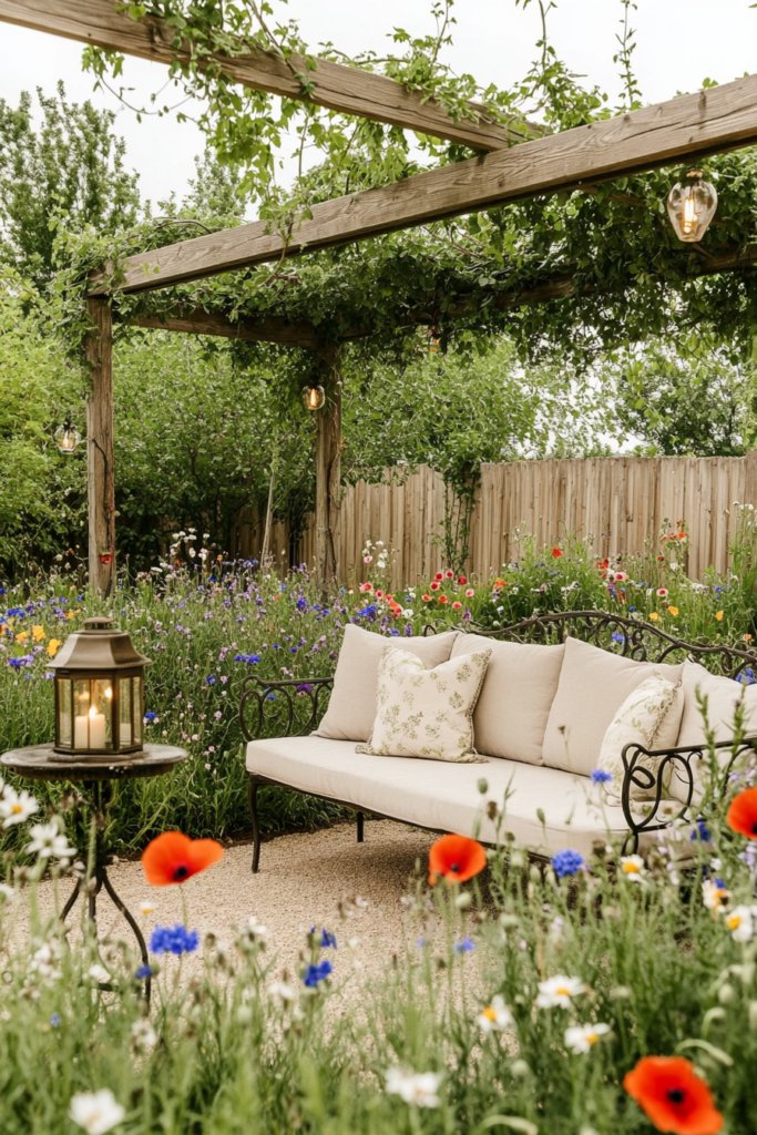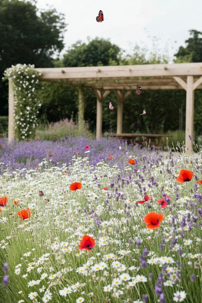 A cozy wooden pergola draped in climbing vines sits amid lavender, daisies, and poppies, with butterflies fluttering around. The scene radiates countryside charm. Achieve this with sprawling floral plantings and a rustic wooden structure.