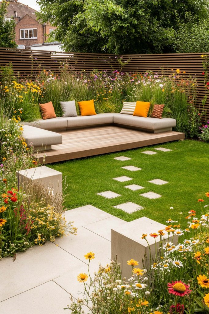 A sleek take on wildflower gardening, featuring minimalist wooden decking, stone seating, and a balanced mix of vibrant and muted flowers. Achieve this modern elegance by blending structured hardscapes with flowing, native plantings.
