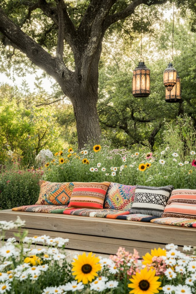A colorful, laid-back setting with Moroccan cushions on a low wooden bench, surrounded by , daisies, and cosmos. Lanterns hang from trees, adding magic. Achieve this by layering bold textiles, warm lighting, and vibrant flowers.