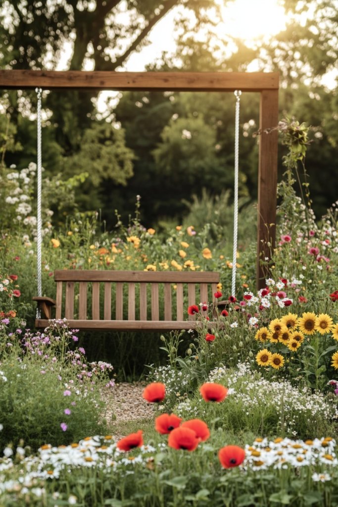 A wooden swing bench is nestled among vibrant poppies, echinacea, and sunflowers, illuminated by soft golden light. To recreate this setting, use warm-hued wildflowers and a gently weathered swing for timeless charm.