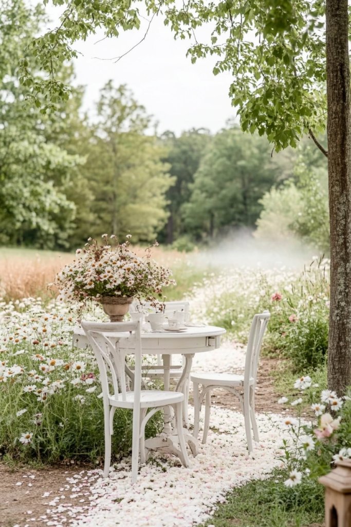A soft, romantic wildflower meadow with pastel blooms, overgrown winding paths, and a vintage white garden set. Ethereal mist adds to its dreamlike quality. Capture this feel with flowing, unstructured plantings and vintage-inspired outdoor furniture.