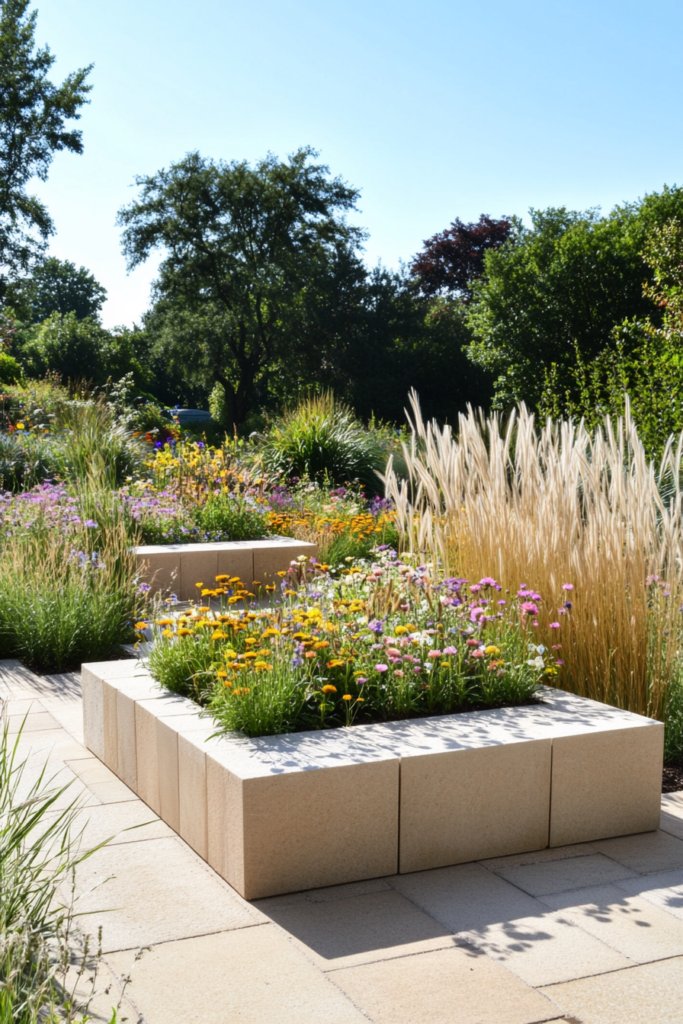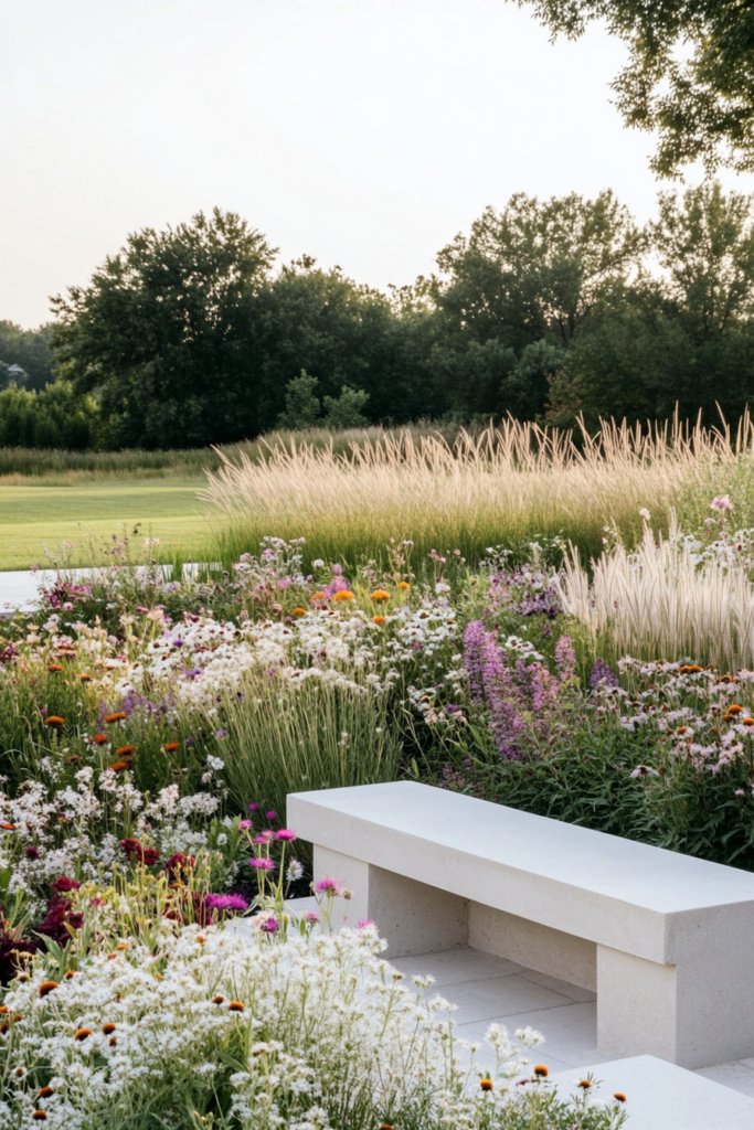 A contemporary space with sleek stone seating, structured layers of wildflowers in pastels and bold hues, and decorative grasses swaying in crisp morning light. Achieve this balance by mixing geometric elements with flowing greenery.
